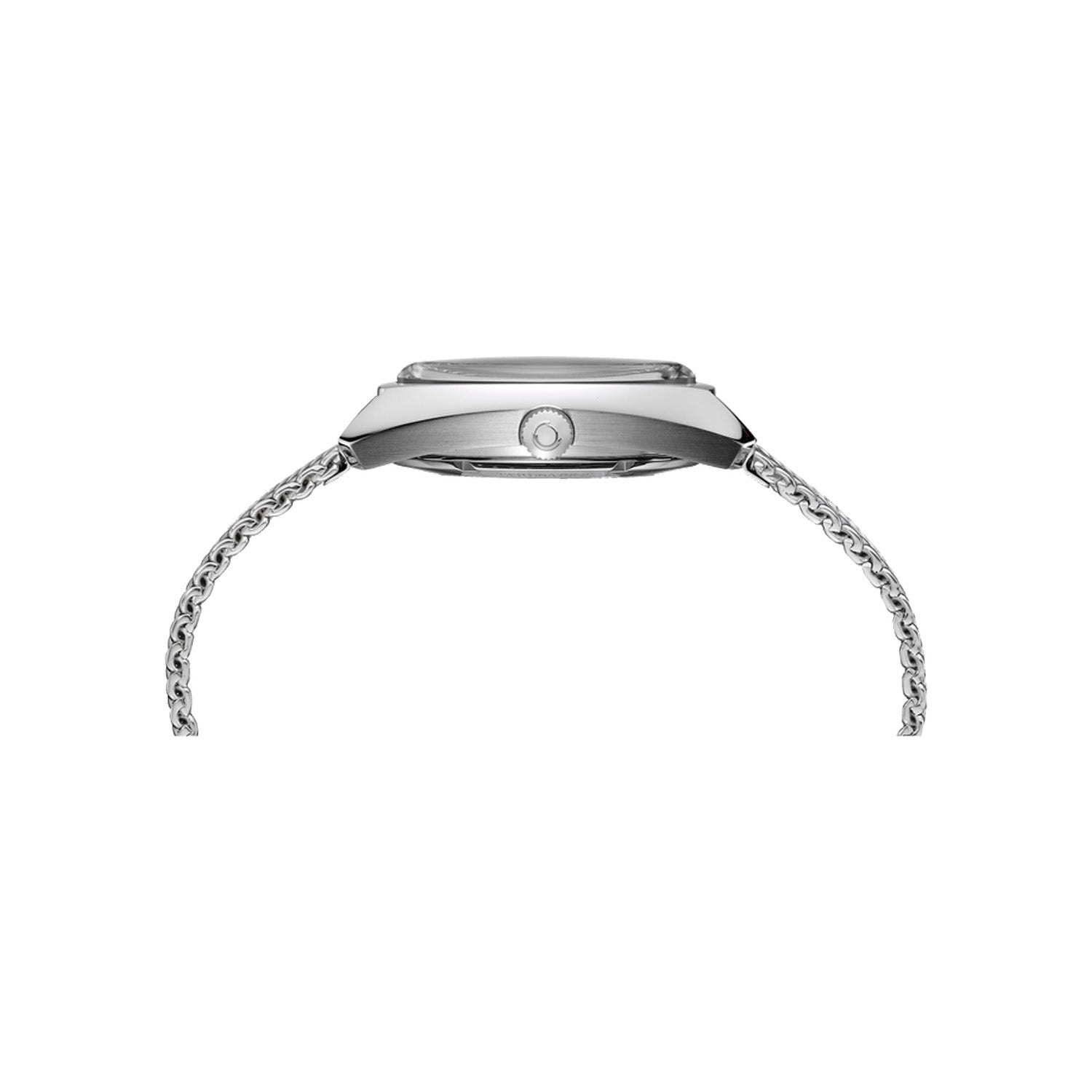 Uret har en iøjnefaldende sort urskive, der står i smuk kontrast til det skinnende stål. Den mesh-lignende lænke tilføjer en moderne kant, mens den polerede urkasse giver et sofistikeret udtryk. Med en diameter på 32,5 mm er det perfekt afbalanceret til både komfort og stil.