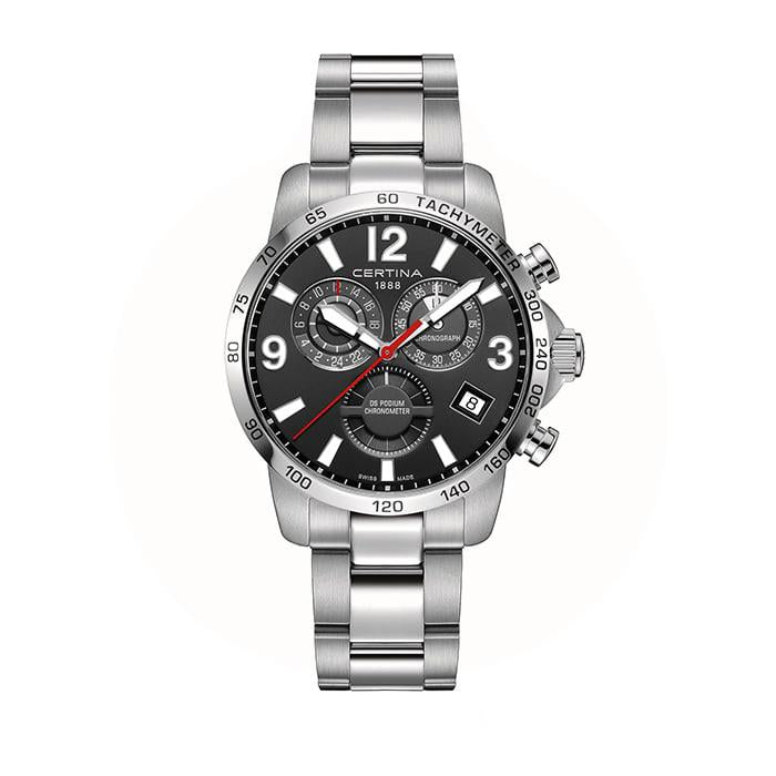 Designet af Certina DS Podium GMT COSC er både robust og elegant. Den rustfri stållænke giver en solid følelse, mens den sorte urskive med kontrasterende hvide markeringer tilføjer et sofistikeret touch. De røde accenter på sekundviseren giver et strejf af dynamik, der fanger øjet. Urets tachymeterfunktion er indgraveret på rammen, hvilket tilføjer et sporty element til det klassiske design.