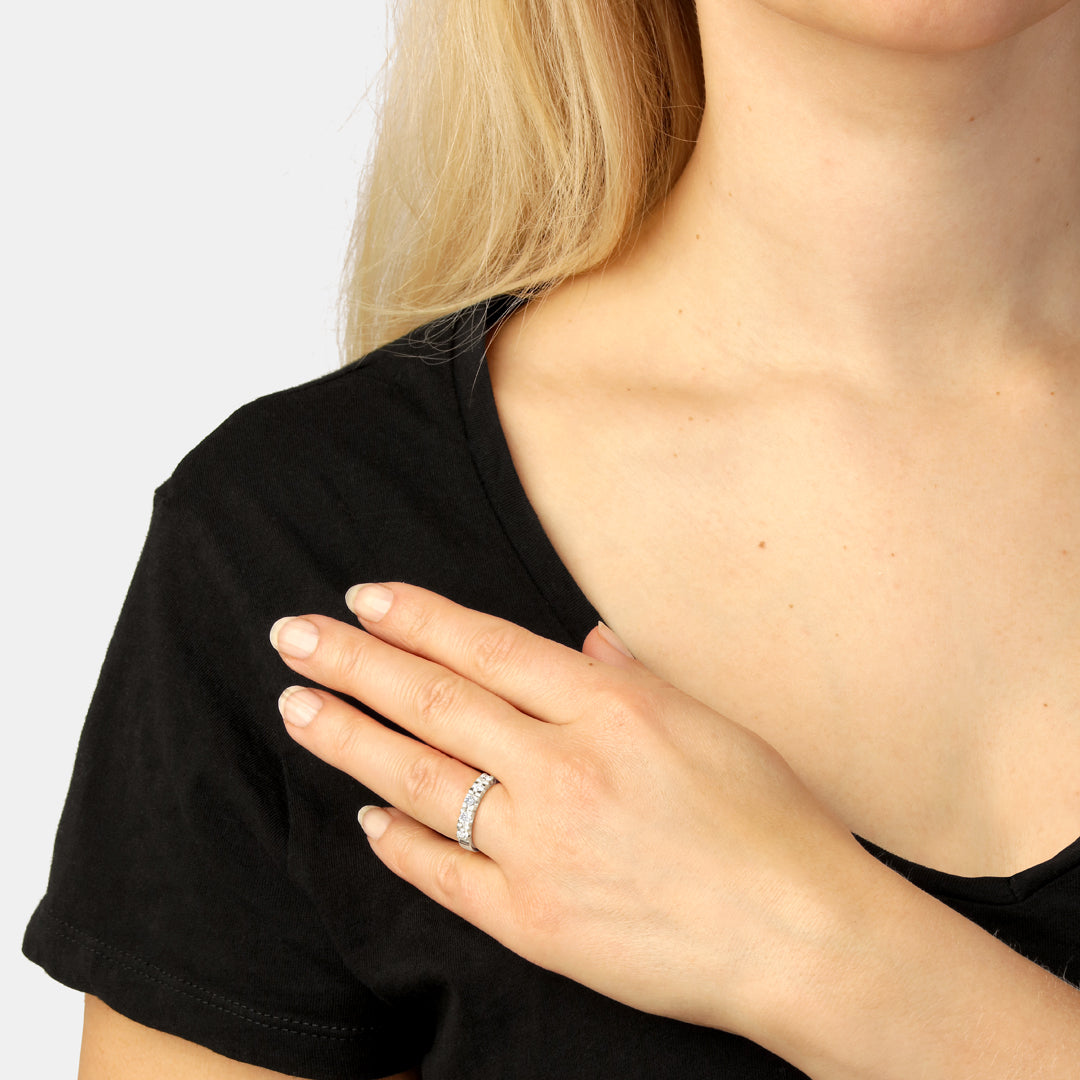 Ringen har en glat og poleret overflade, der føles behagelig mod huden. Den kølige, sølvfarvede tone af hvidguld fremhæver de klare diamanters skønhed, hvilket skaber en harmonisk balance mellem metal og sten. De præcist indfattede diamanter sidder tæt sammen, hvilket giver et kontinuerligt skinnende bånd, der fanger lyset fra alle vinkler.