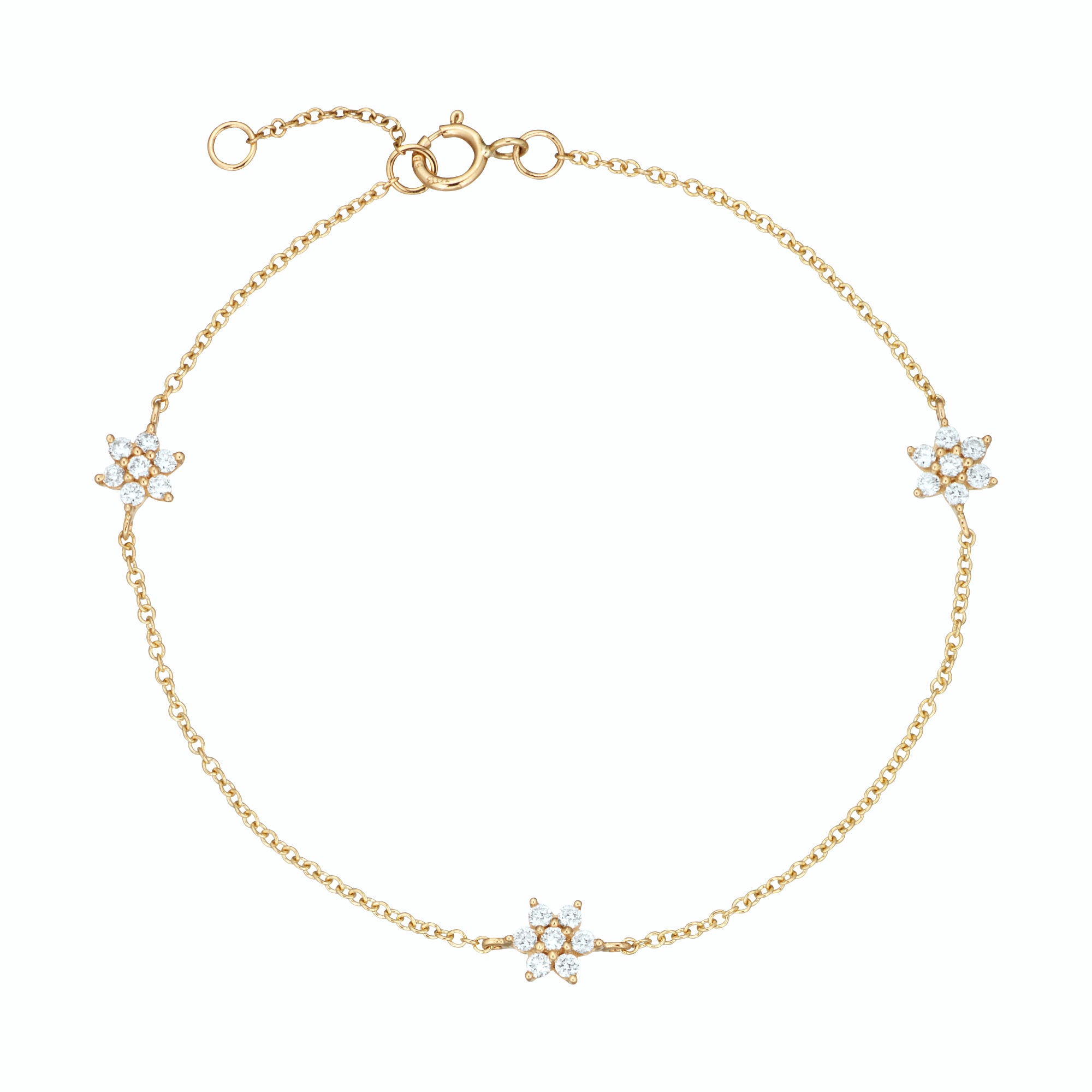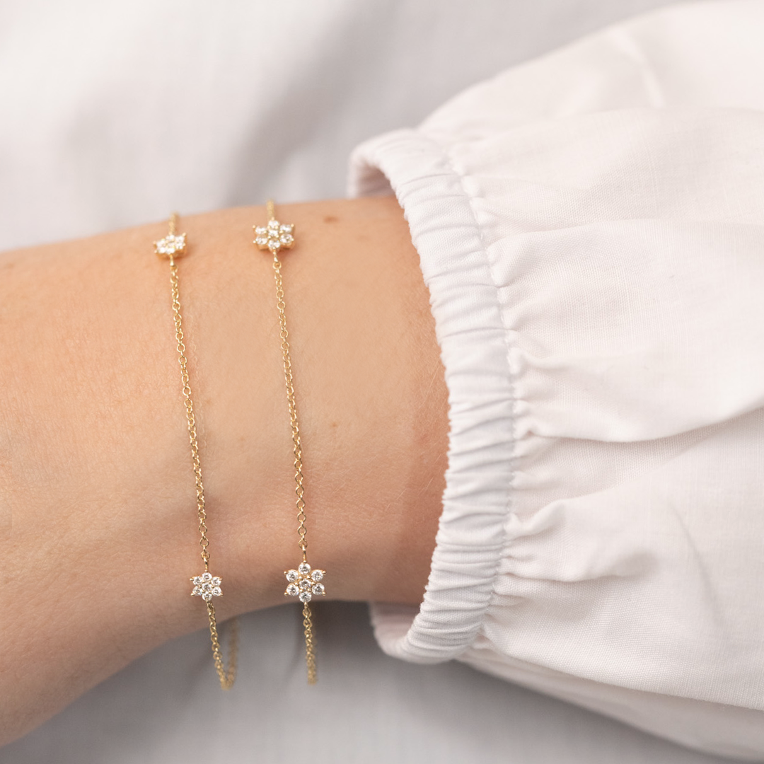 Armbåndet har en delikat kæde, der smyger sig elegant om håndleddet. De små blomsterformede diamanter er strategisk placeret for at fange lyset fra alle vinkler, hvilket skaber en strålende effekt. Den gyldne nuance af 14 karat guld fremhæver diamantens klare glans og giver en varm, indbydende følelse.