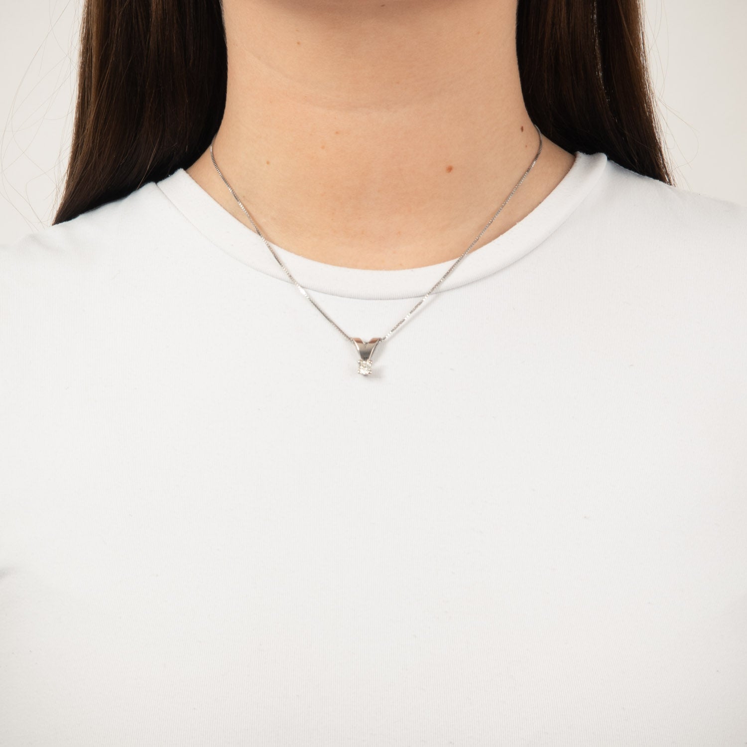 Vedhænget har en V-formet indfatning, der elegant fremhæver den funklende diamant. Den glatte overflade af hvidguld giver en kølig, sofistikeret tone, der komplementerer enhver hudfarve. Det minimalistiske design sikrer, at vedhænget kan bæres alene for et enkelt look eller kombineres med andre smykker for en mere dramatisk effekt.