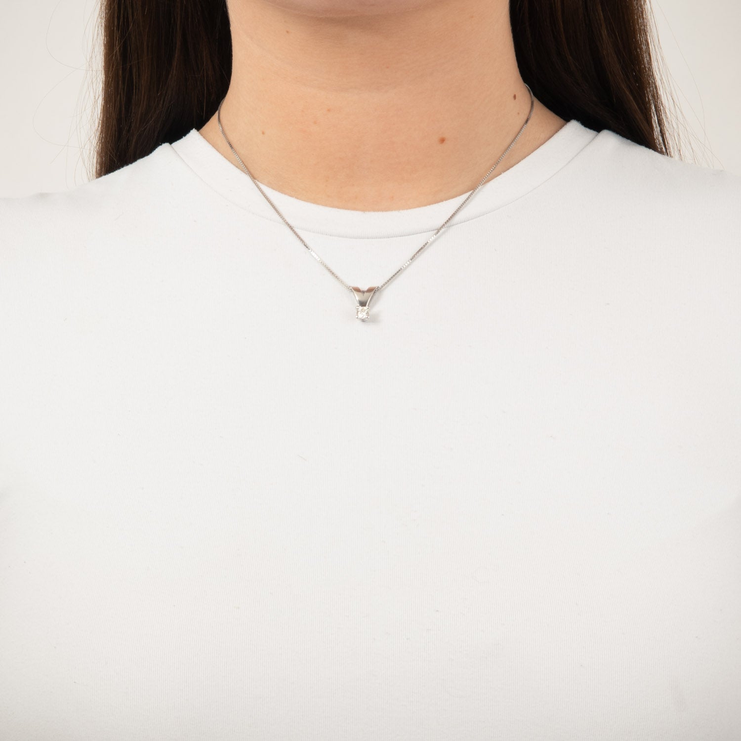 Vedhænget har en slank og raffineret form, der fremhæver diamantens klare skønhed. Den kølige tone af hvidguld komplementerer diamantens glans og skaber et sofistikeret udtryk. Den glatte overflade og det enkle design gør det nemt at bære alene eller sammen med andre smykker for et lagdelt look.