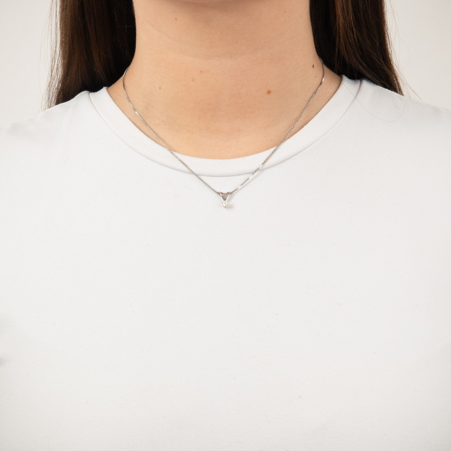 Vedhænget har en smuk, poleret overflade, der fremhæver den klare diamant. Den kølige tone i hvidguldet komplementerer diamantens glans og giver et sofistikeret udtryk. Den V-formede indfatning tilføjer en moderne kant, mens den samtidig sikrer, at diamanten er i fokus.