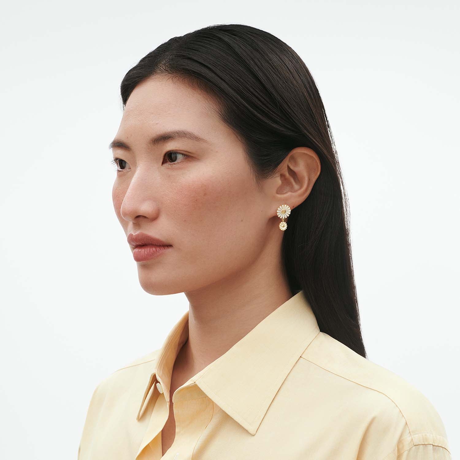Øreringene er inspireret af den klassiske margueritblomst, hvilket giver dem et naturligt og feminint udtryk. De delikate kronblade i hvid emalje står i smuk kontrast til det forgyldte sølv, hvilket skaber en iøjnefaldende effekt. Den dobbelte blomst giver en dynamisk bevægelse, der fanger lyset og tilføjer liv til dit look.