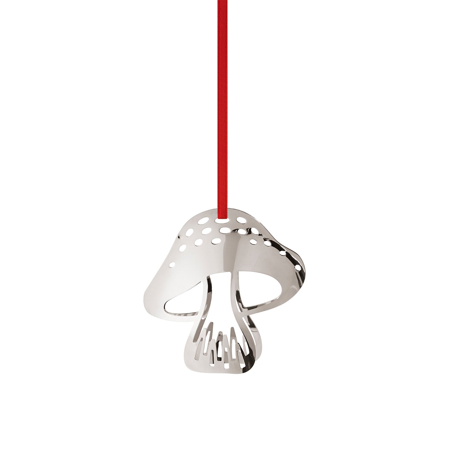 Det vedhæftede billede viser ornamentets delikate detaljer og skinnende overflade. Den røde snor tilføjer en klassisk kontrast til det polerede metal, hvilket gør det til et iøjnefaldende element på dit juletræ. Ornamentets svampeform er både moderne og traditionel, hvilket gør det til en perfekt gave eller en særlig tilføjelse til din egen samling.