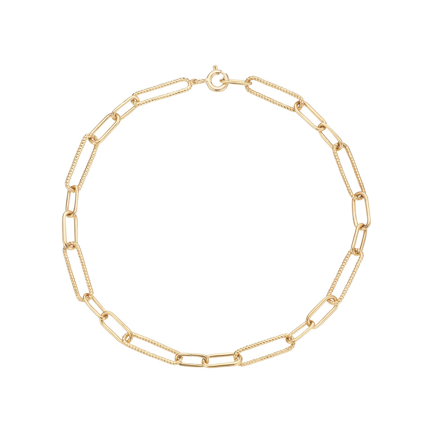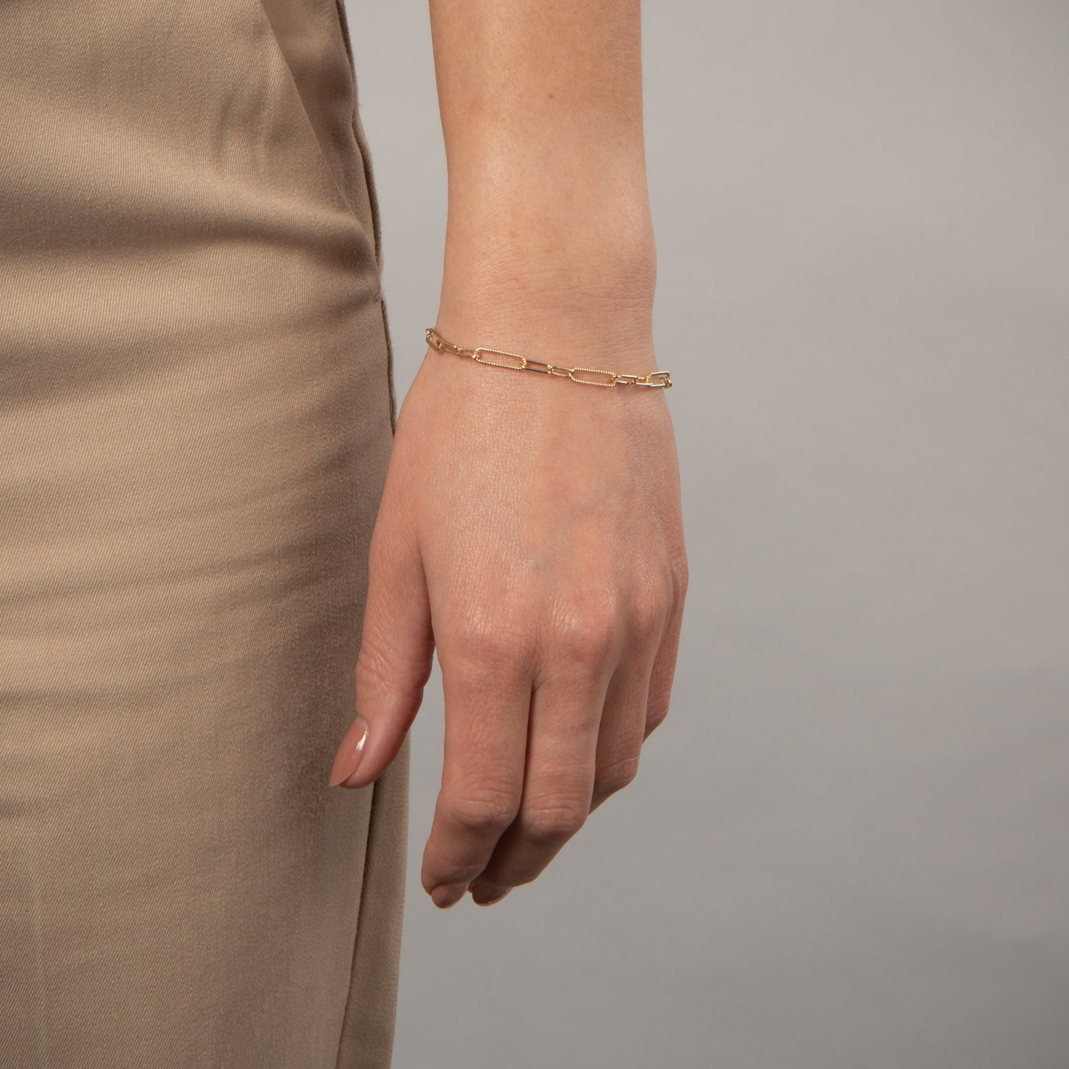Armbåndet er udført i en smuk guldfarve, der tilføjer et strejf af luksus til dit look. De fine kædeled giver en let og luftig følelse, mens den skinnende overflade fanger lyset på en elegant måde. Dette armbånd er både stilfuldt og alsidigt, hvilket gør det ideelt til både hverdag og festlige begivenheder.