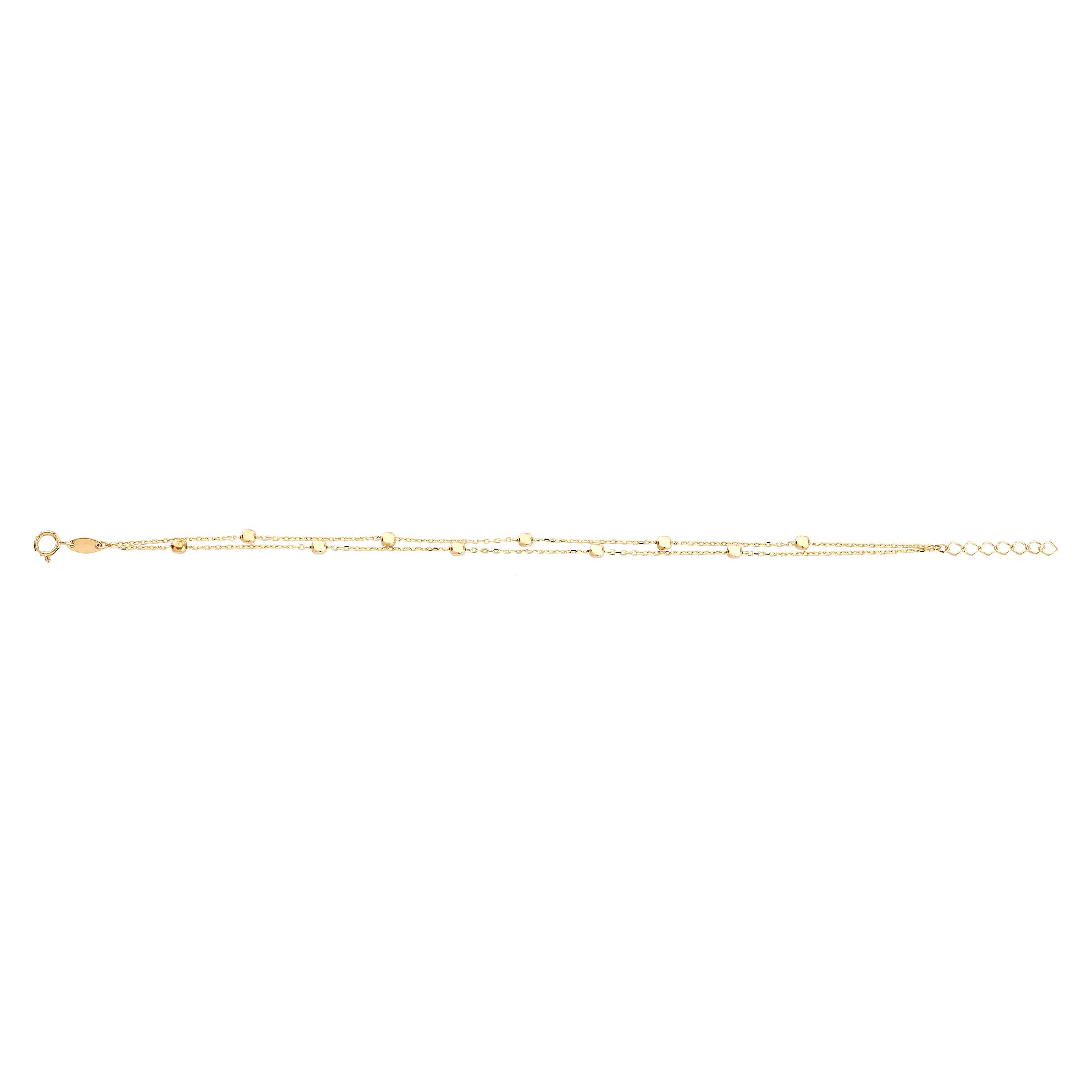 På billedet ses armbåndets delikate kæde, der er prydet med små, glinsende kugler, som fanger lyset smukt. Den gyldne nuance giver en varm og indbydende følelse, mens den fine struktur sikrer en behagelig pasform. Armbåndet er let og elegant, hvilket gør det ideelt til daglig brug, samtidig med at det udstråler en subtil luksus.