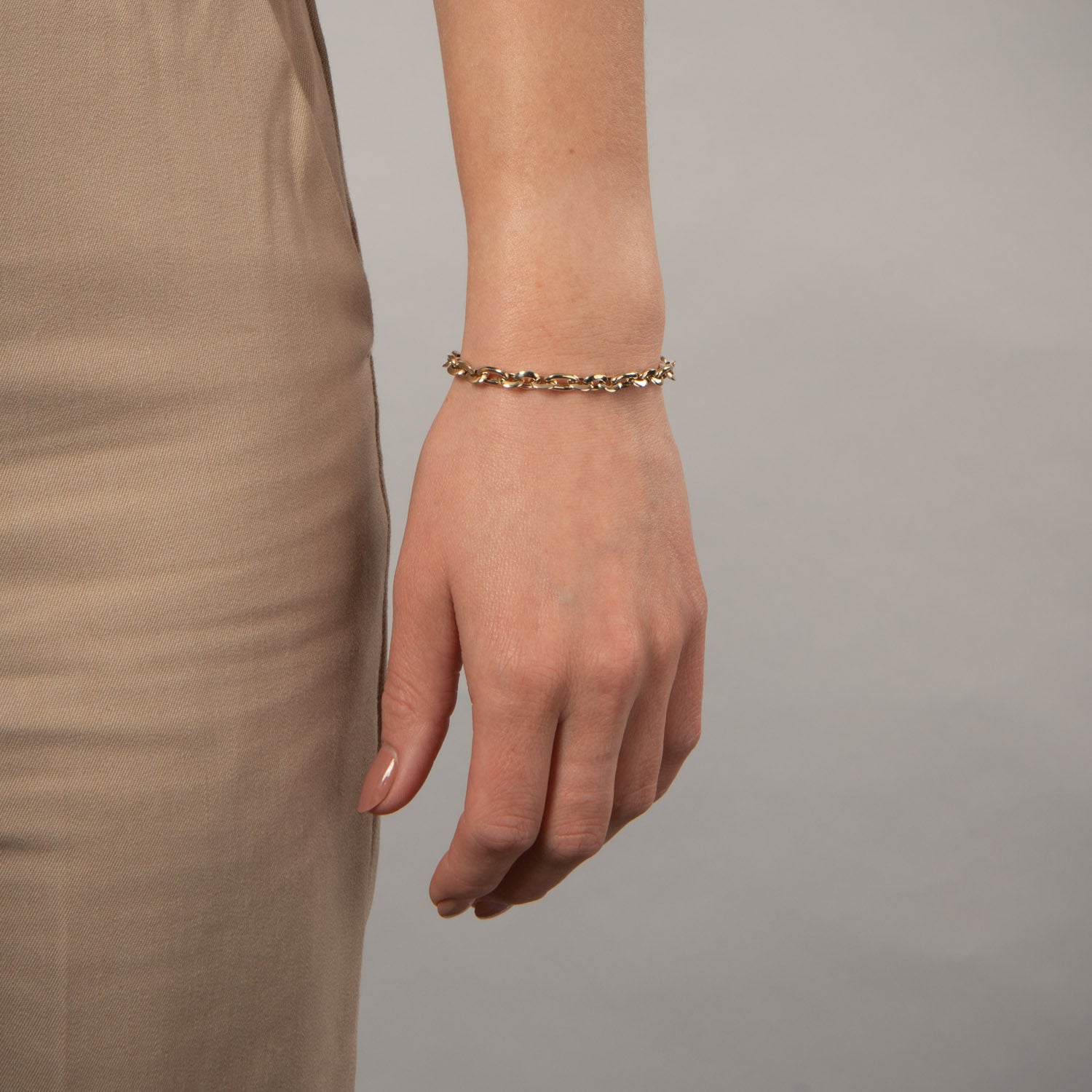 Armbåndet er udført i en smuk guldfarve, der tilføjer et strejf af luksus til dit håndled. De glatte, polerede led giver en behagelig følelse mod huden, mens den sikre lås sikrer, at armbåndet bliver på plads hele dagen. Det enkle, men sofistikerede design gør det nemt at matche med både afslappet og formel påklædning.