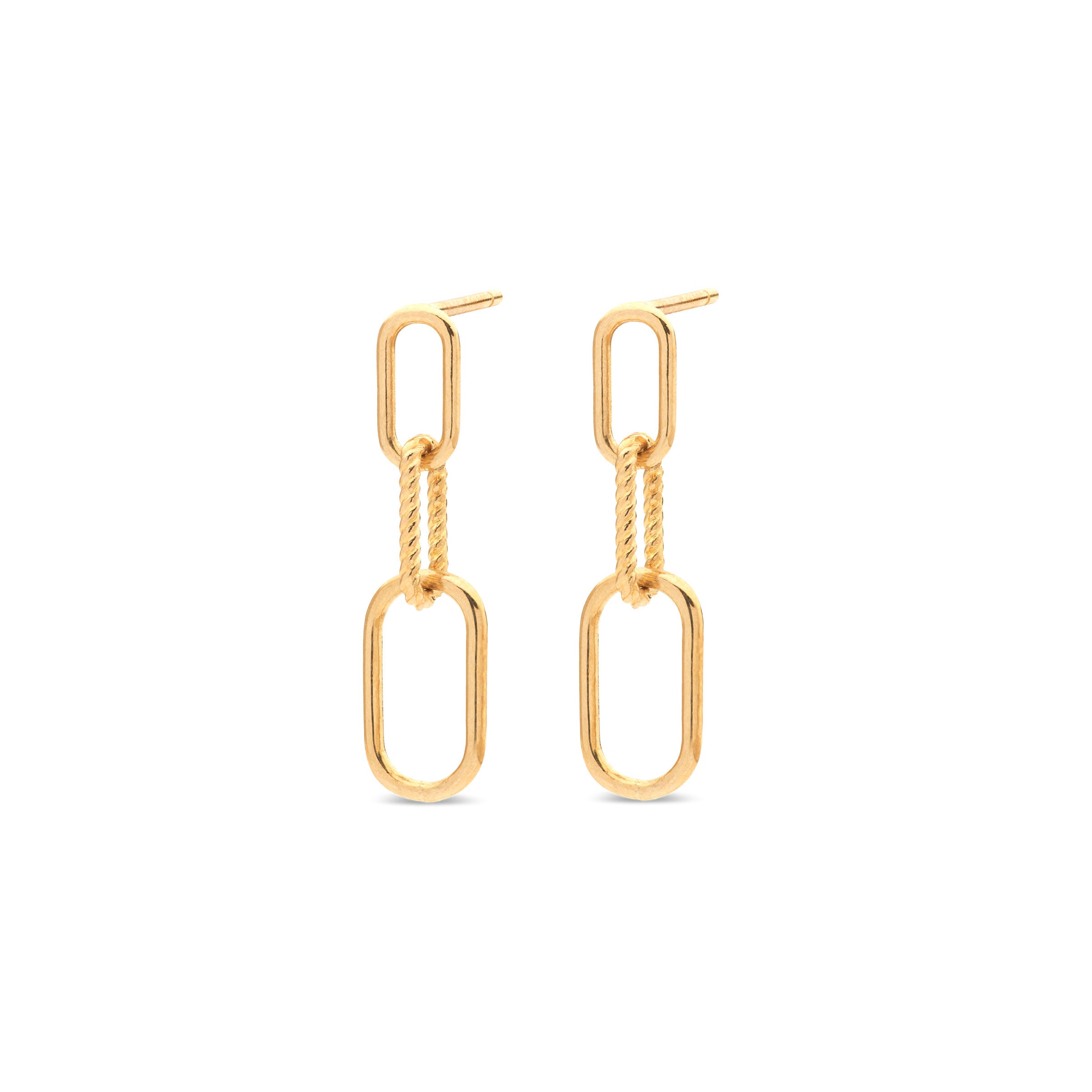 Disse ørehængere er udført i en smuk guldfarve, der fanger lyset på en subtil og elegant måde. Designet består af sammenkædede led, der giver en moderne og stilren æstetik. Den glatte overflade og den skinnende finish gør dem til et iøjnefaldende tilbehør, der kan bæres til både formelle og uformelle begivenheder.