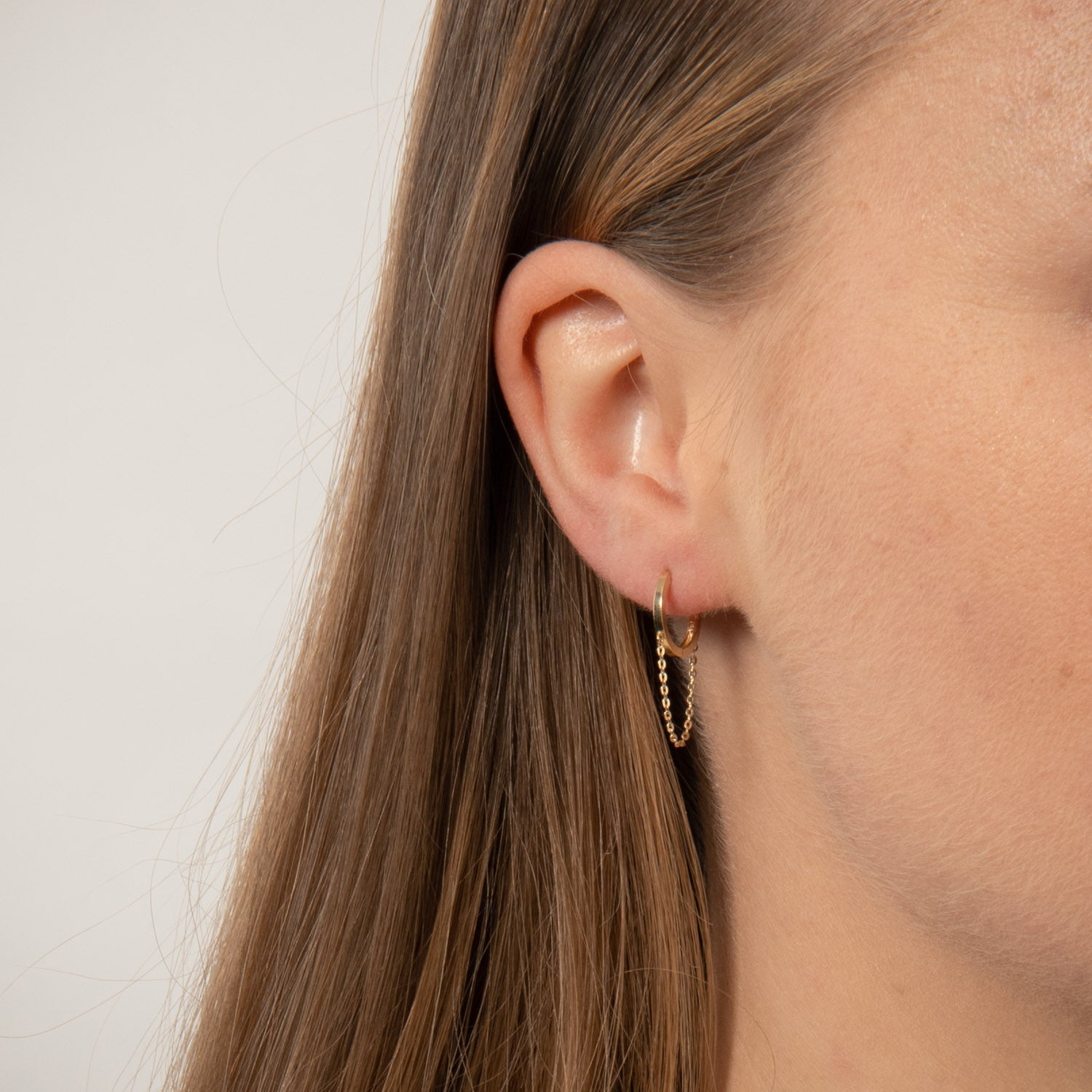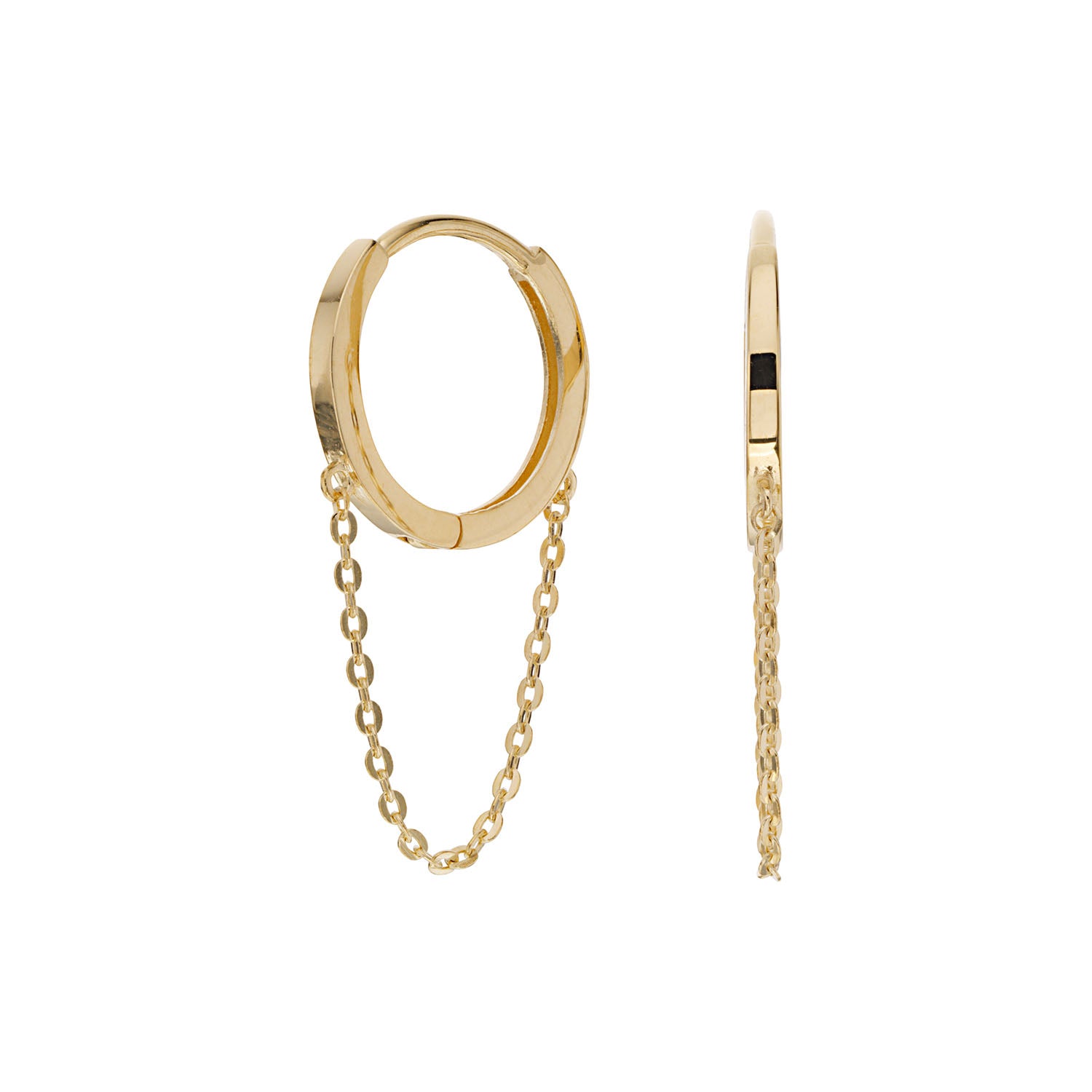 På billedet ses de smukke creoler med en skinnende guldfinish, der fanger lyset på en betagende måde. Den fine kæde, der forbinder de to dele, tilføjer et unikt og moderne twist til det klassiske design. Den glatte tekstur og den varme guldfarve skaber en følelse af luksus og elegance, der gør dem til et must-have i enhver smykkesamling.