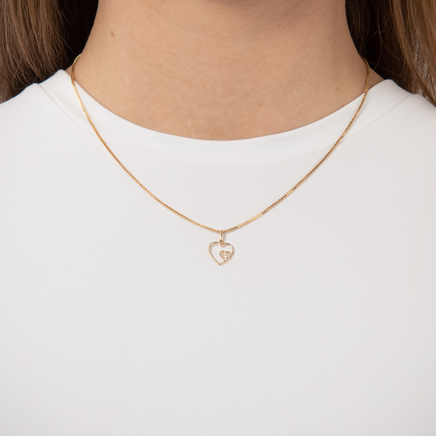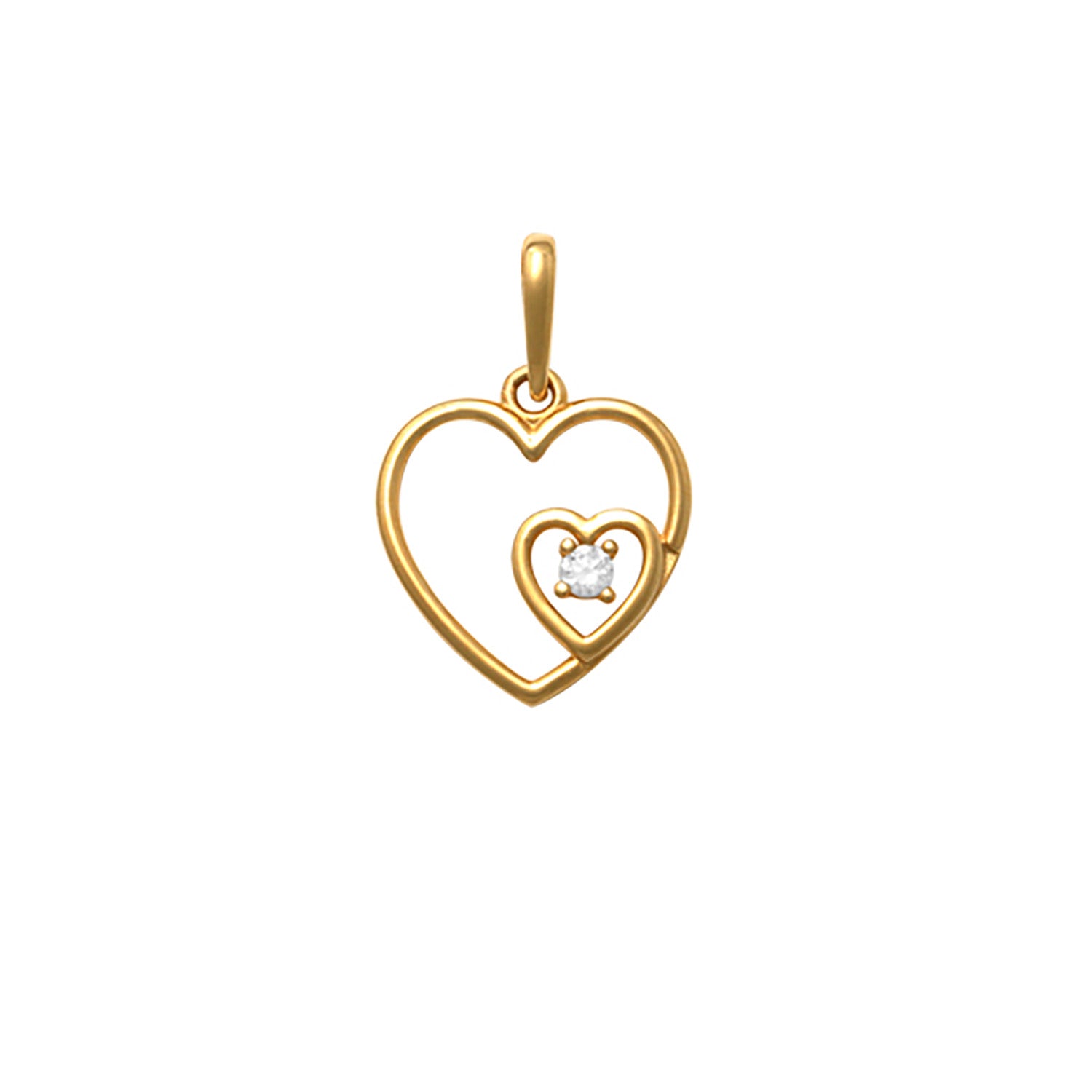 Vedhænget er udført i en smuk gylden nuance, der tilføjer et strejf af luksus til dit look. De to hjerter, der er indlejret i hinanden, skaber en følelse af dybde og dimension. Det indre hjerte er prydet med en funklende sten, der fanger lyset og tilføjer en subtil glans.