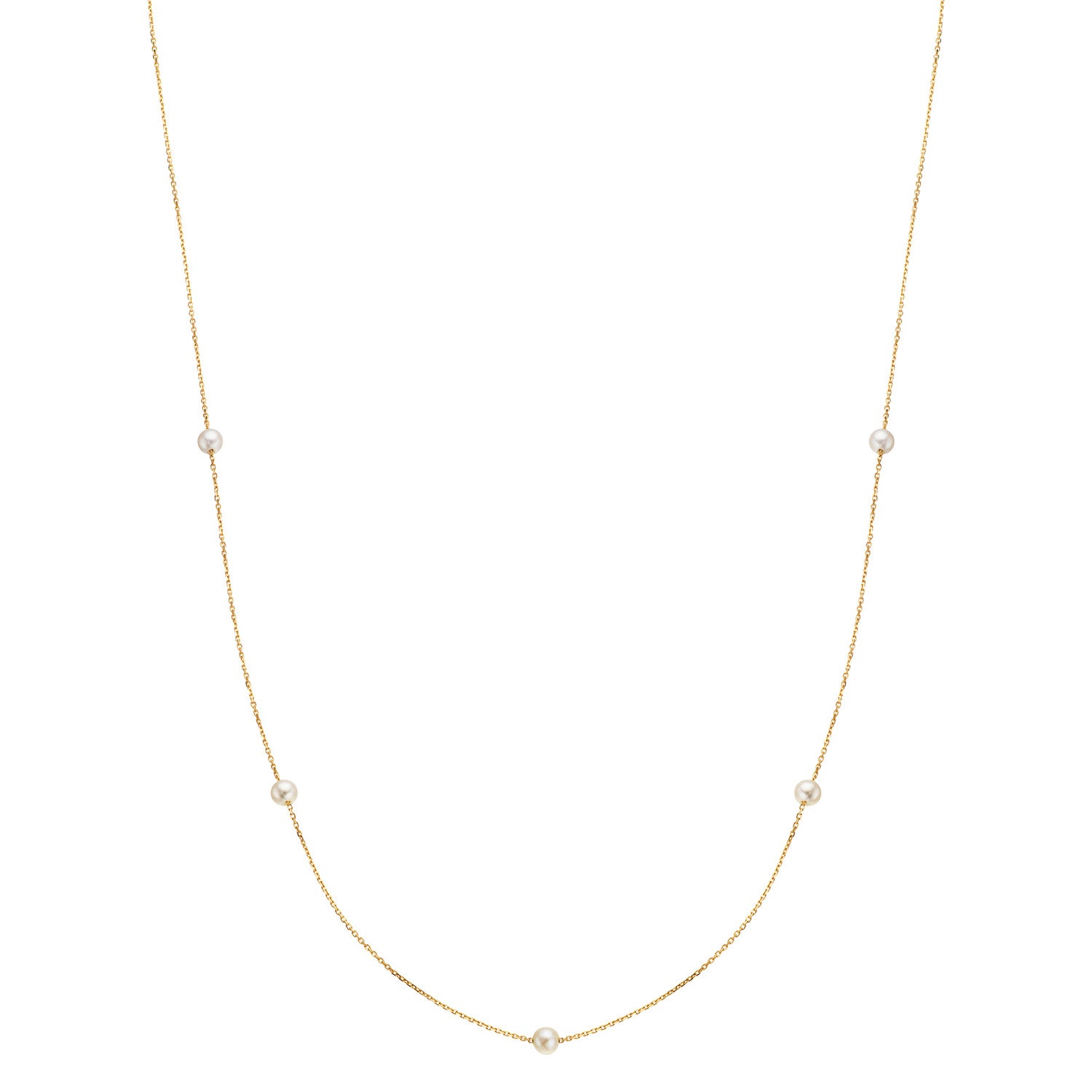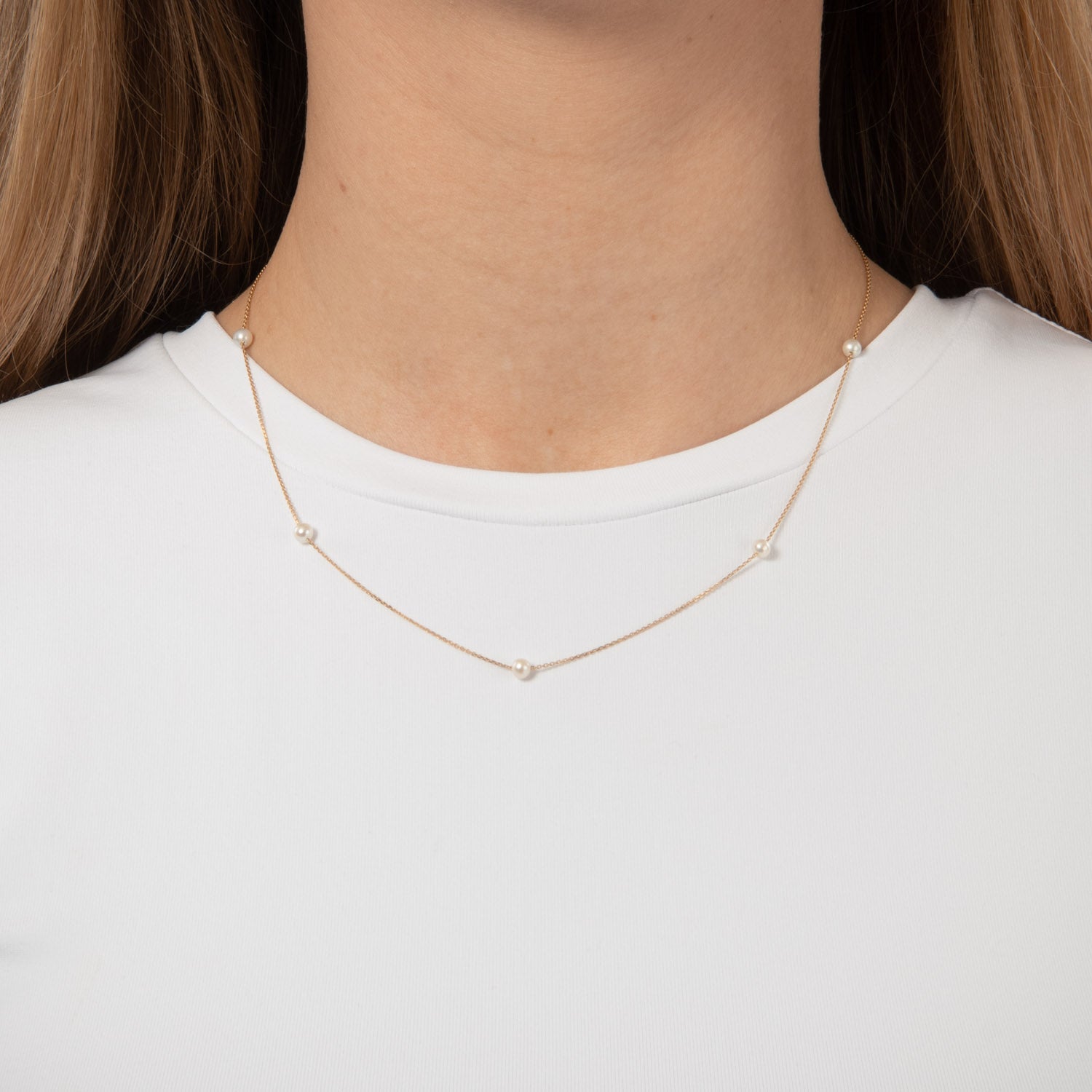 På billedet ser vi en subtil og raffineret halskæde, der udstråler en varm gylden glød. De små perler, jævnt fordelt langs kæden, tilføjer en diskret elegance, der fanger lyset smukt. Den fine kæde ligger let om halsen og giver en følelse af lethed og komfort. Dette smykke er ideelt til dem, der ønsker at tilføje et strejf af luksus til deres daglige look uden at overvælde.