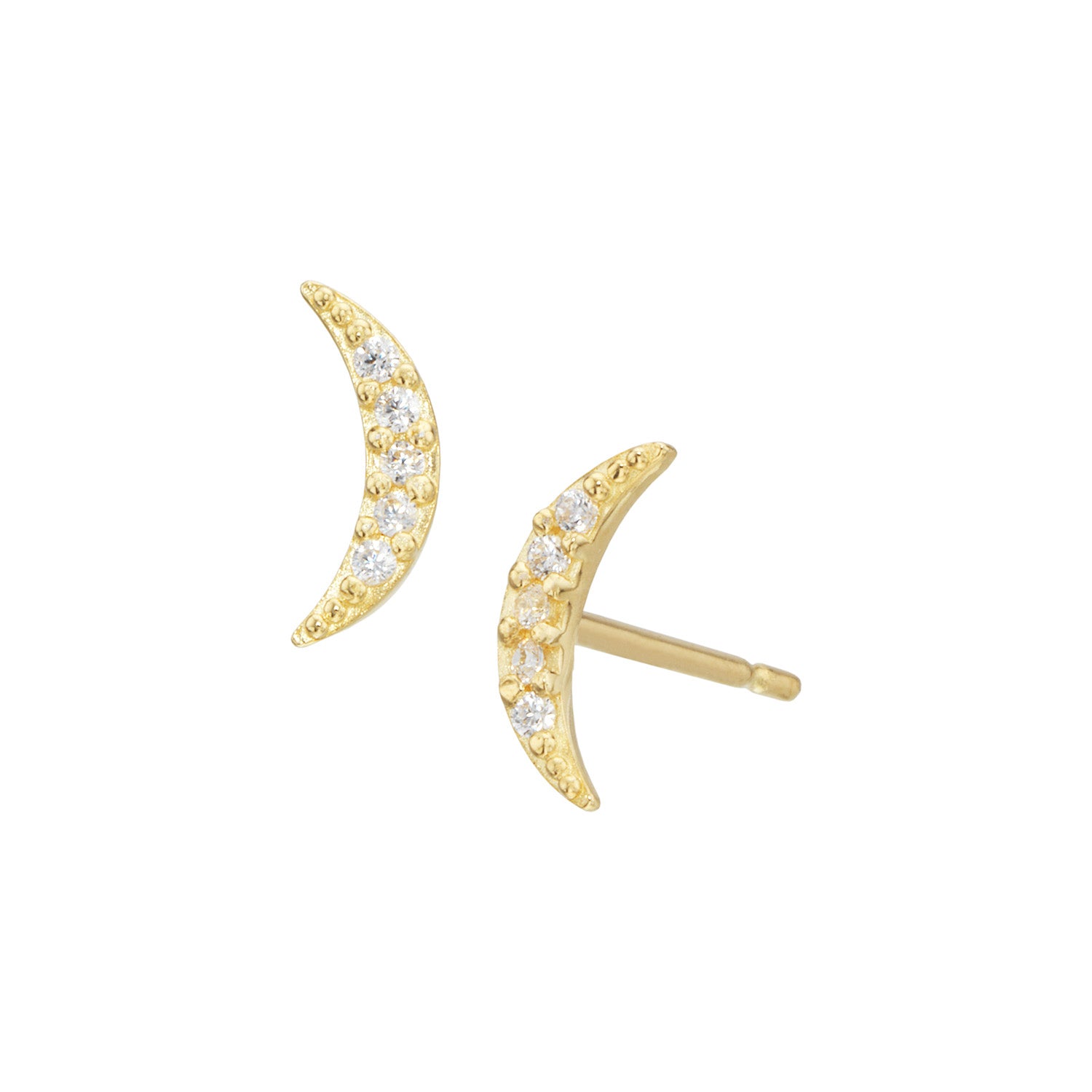 På billedet ser du de delikate halvmåne ørestikker, der er udført i en smuk gylden nuance. De små, funklende sten er omhyggeligt indsat langs kurven, hvilket tilføjer en subtil glans, der fanger lyset fra alle vinkler. Den glatte overflade og de fine detaljer gør dem til et tidløst smykke, der kan bæres alene eller kombineres med andre smykker for et mere personligt look.