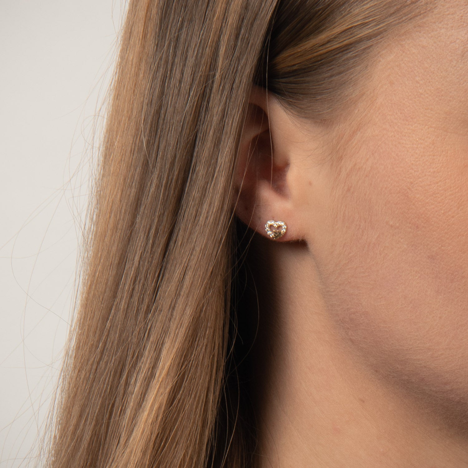 Ørestikkerne har en smuk hjerteform, der er omkranset af funklende sten, hvilket giver et sofistikeret og feminint udtryk. Den gyldne farve skinner blidt og tilføjer en varm glød til dit look. Det delikate design gør dem lette og behagelige at bære hele dagen.