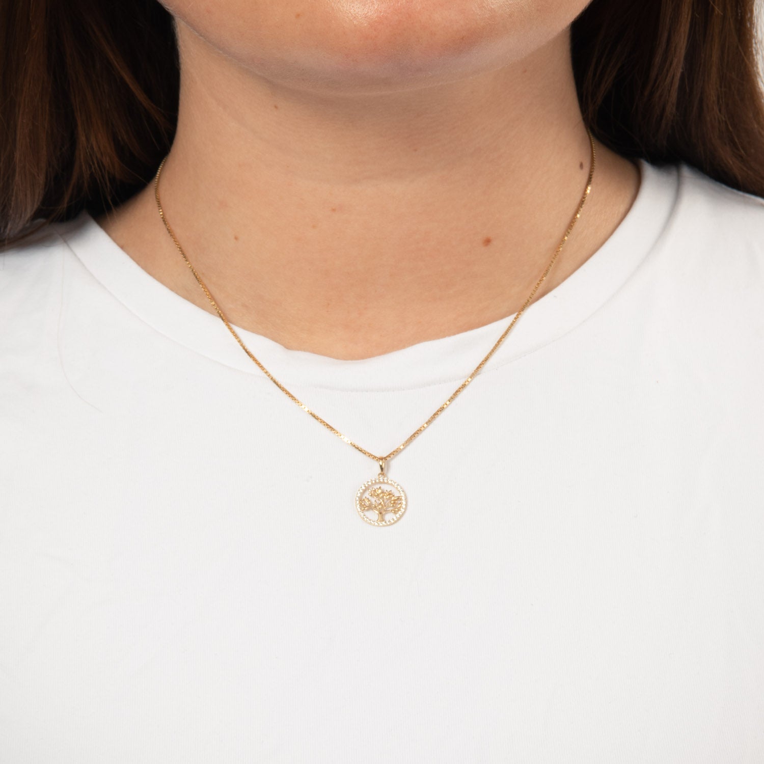 Vedhænget er udført i en varm gylden nuance, der fanger lyset smukt. Det detaljerede design af livets træ er omkranset af en cirkel af funklende sten, der tilføjer en subtil glans. De fine grene og blade er omhyggeligt udformet, hvilket giver en følelse af dybde og dimension. Når du bærer dette vedhæng, vil du mærke den glatte tekstur af det polerede guld mod din hud, hvilket gør det både behageligt og stilfuldt.