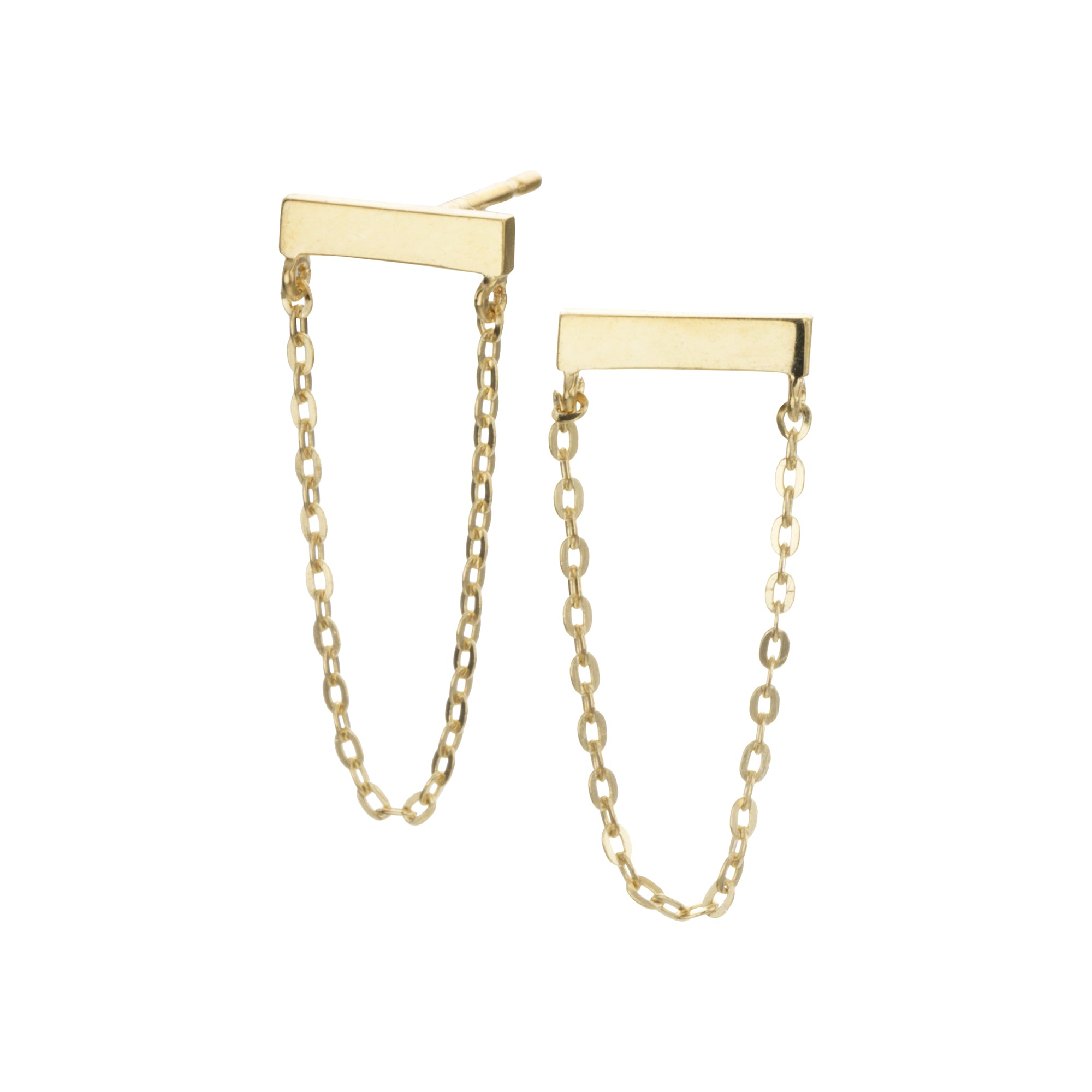 Disse øreringe har en smuk guldfarvet finish, der fanger lyset på en subtil og sofistikeret måde. Den delikate kæde tilføjer en unik dimension, der skaber bevægelse og liv. Øreringene er designet med en rektangulær top, der giver et moderne udtryk, mens kæden tilfører et strejf af elegance. Den glatte overflade og den fine kæde skaber en harmonisk balance mellem det klassiske og det moderne.