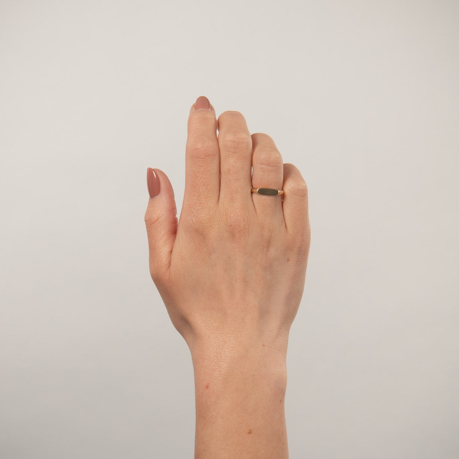 Ringen er fremstillet af 8 kt. guld, hvilket giver den en varm og indbydende glød. Det enkle, men sofistikerede design gør den til et alsidigt smykke, der kan bæres alene eller sammen med andre ringe for et lag-på-lag look.