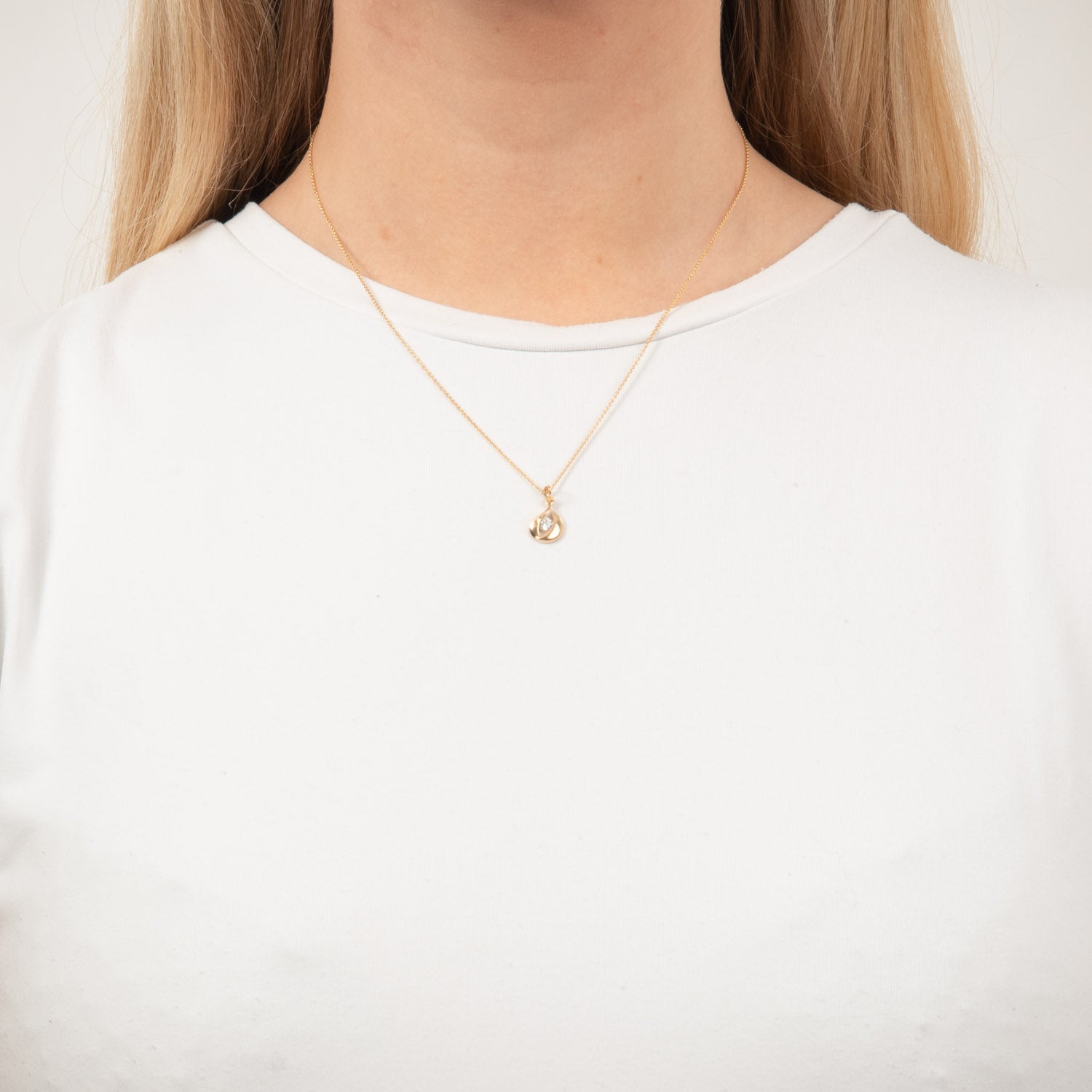 Dette vedhæng er en sand fryd for øjet. Den gyldne kæde fremhæver den klare zirkonia, der er smukt indrammet i midten. Den subtile glans fra guldet og den funklende sten skaber en harmonisk balance, der tiltrækker opmærksomhed uden at være overvældende.