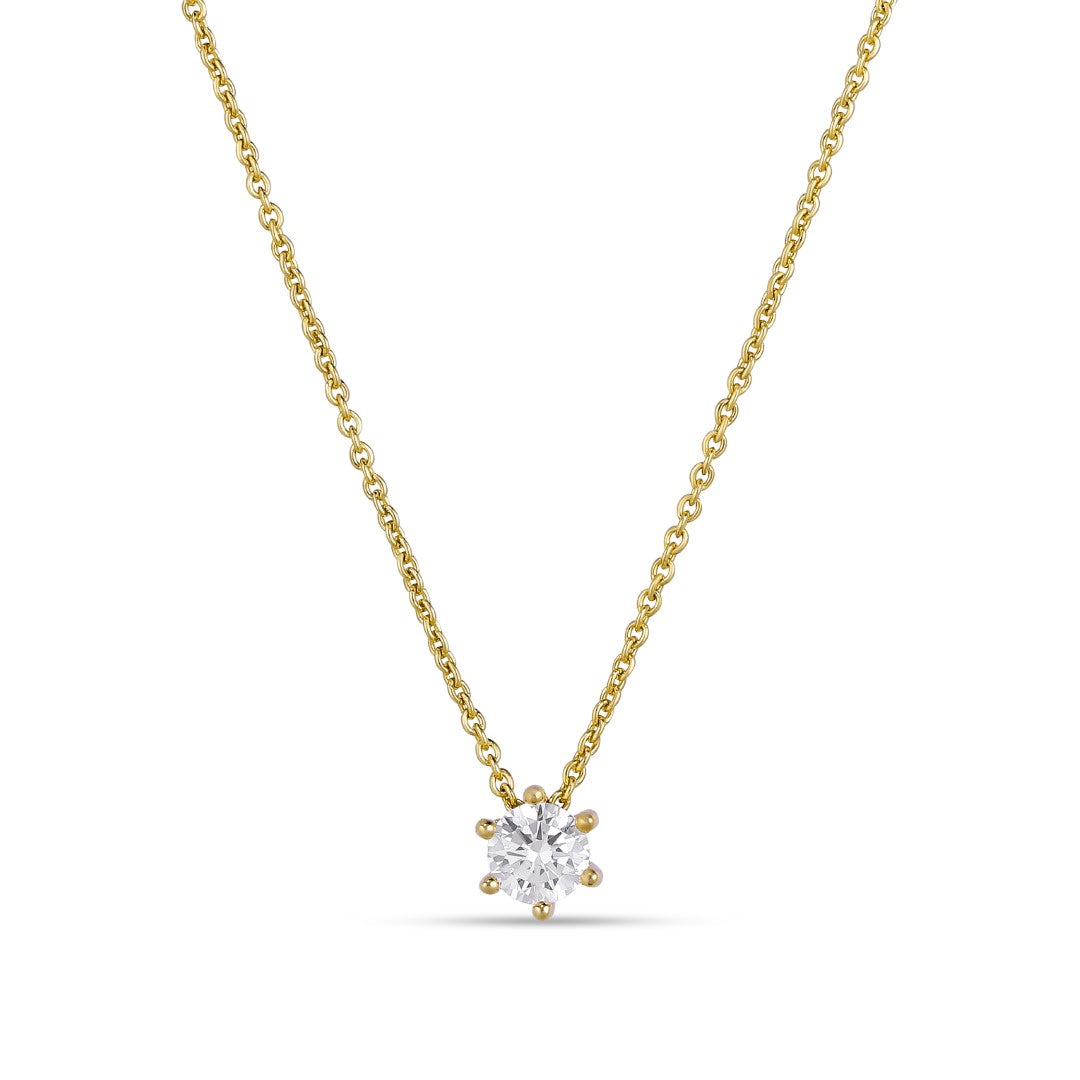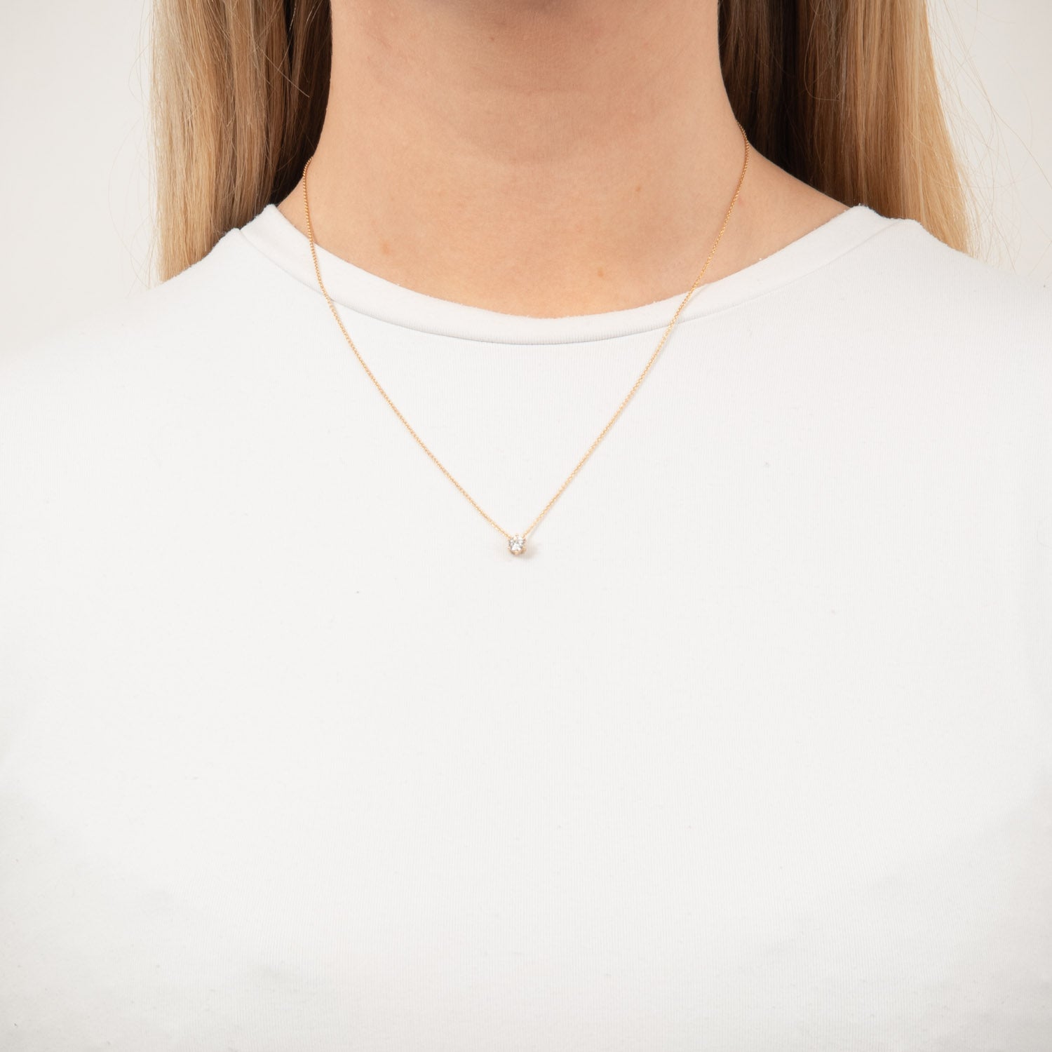 På billedet kan du se, hvordan den gyldne farve skinner med en varm glød, mens zirkoniaen tilføjer en subtil gnist. De seks grabber holder stenen sikkert på plads og giver et sofistikeret udtryk. Den fine kæde er både delikat og robust, hvilket gør den behagelig at bære hele dagen.