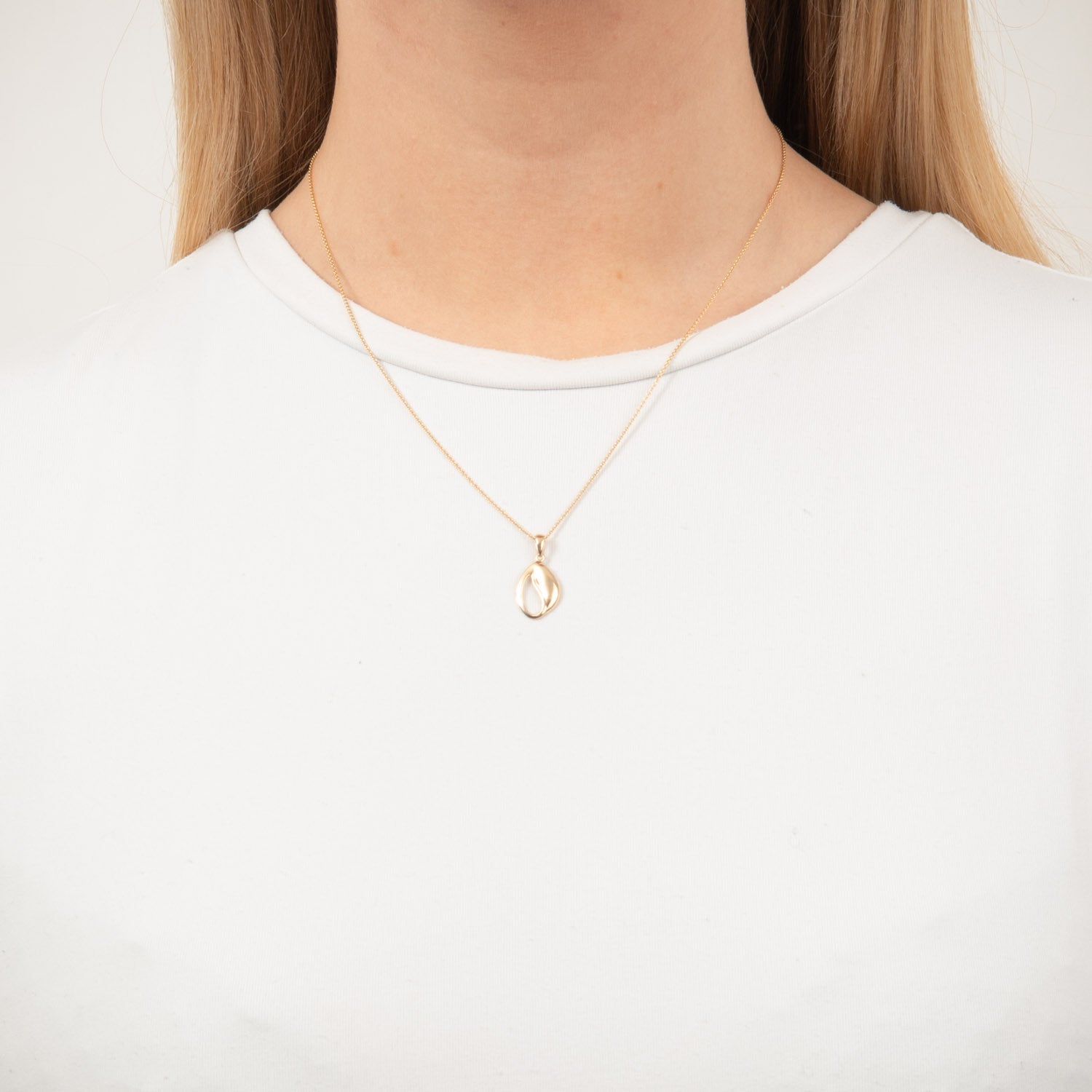 Designet er enkelt, men sofistikeret, med et vedhæng, der har en blød, organisk form. Den glatte overflade reflekterer lyset og tilføjer en subtil glans til dit look. Dette smykke er perfekt til at bære alene eller i kombination med andre favoritter for et personligt udtryk.