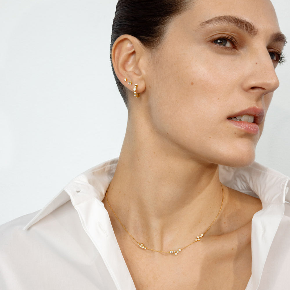 Halskæden fremstår med en delikat kæde, der elegant omfavner halsen. De funklende diamanter er smukt indfattet og skaber et subtilt, men iøjnefaldende udtryk. Den gyldne nuance af 18 kt. guld harmonerer perfekt med diamantens klare skær, hvilket gør denne halskæde til et ideelt valg til både hverdag og særlige lejligheder.