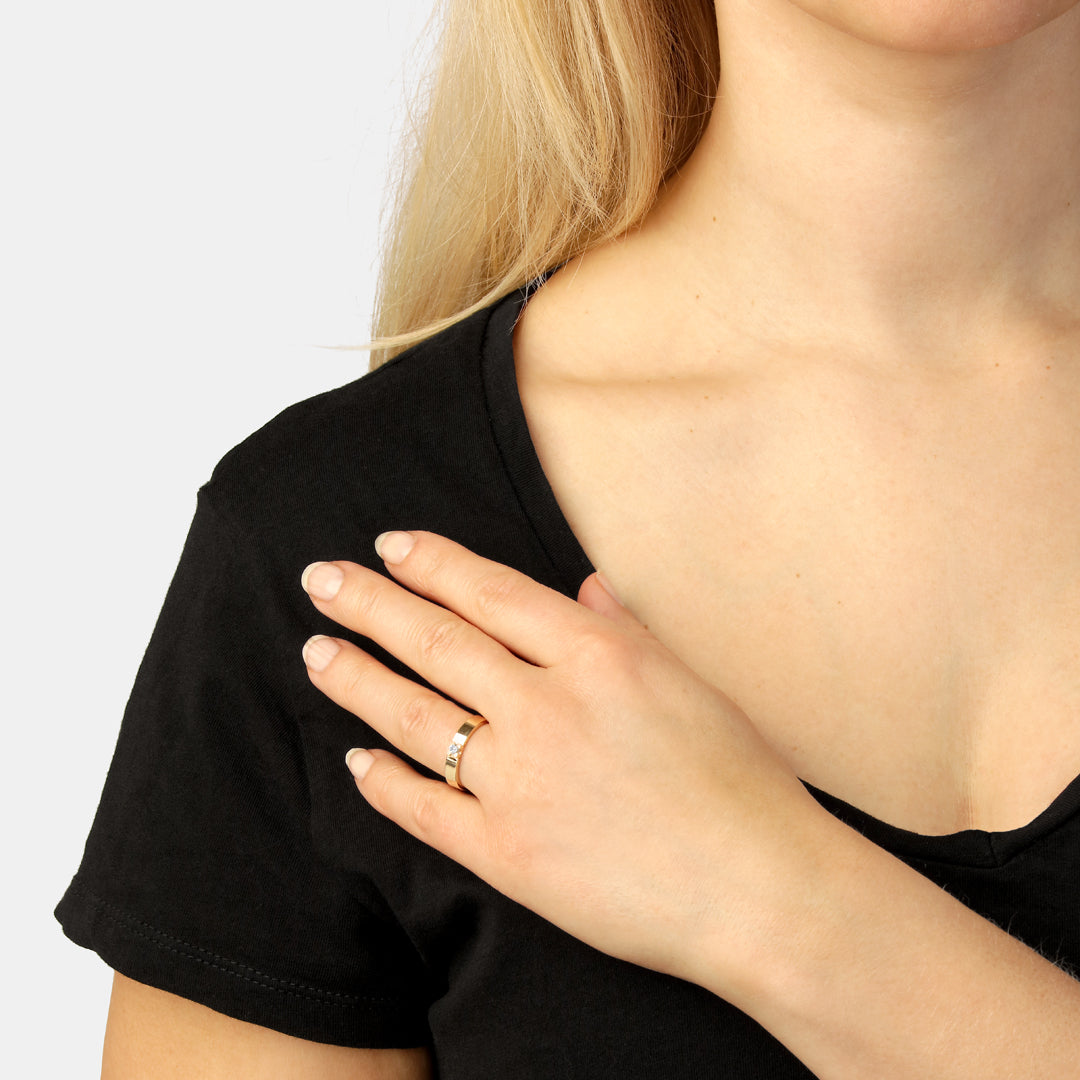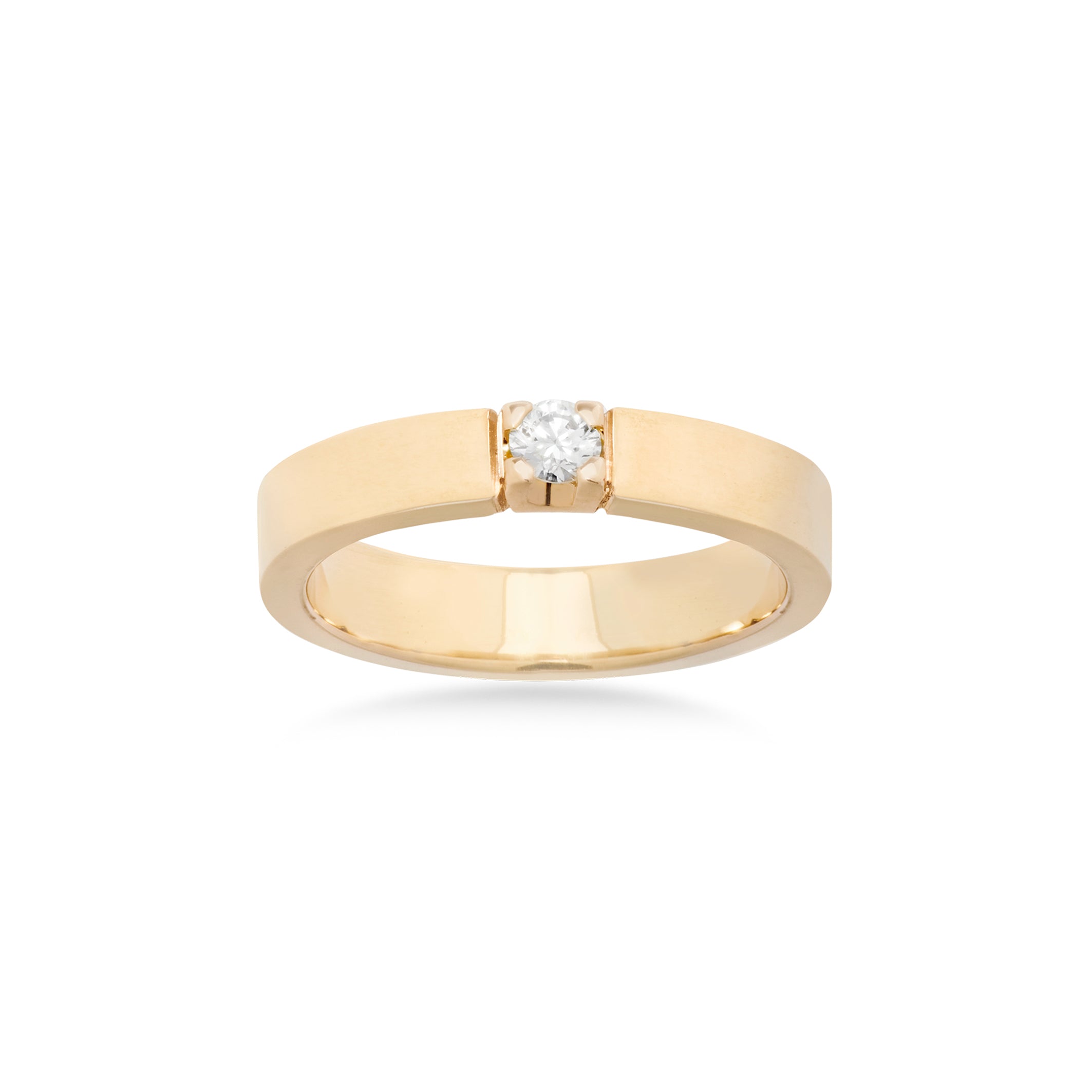 Ringen har en glat og poleret overflade, der føles behagelig mod huden. Den varme, gyldne farve fremhæver diamantens klare skønhed og skaber en harmonisk balance mellem materialer og design. Den enkle, men sofistikerede stil gør ringen alsidig og velegnet til både hverdagsbrug og særlige lejligheder.