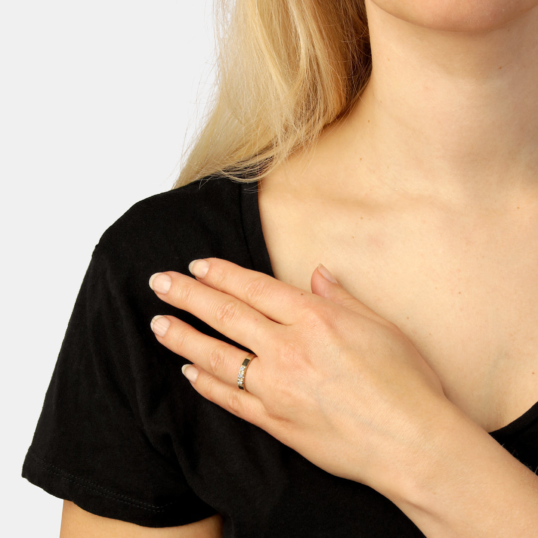 Ringen har en glat og poleret overflade, der føles silkeblød mod huden. Den varme, gyldne farve fremhæver diamantens klare glans og skaber en harmonisk balance mellem elegance og enkelhed. De præcist indfattede diamanter er placeret i en linje, hvilket giver ringen et moderne og stilrent udtryk.