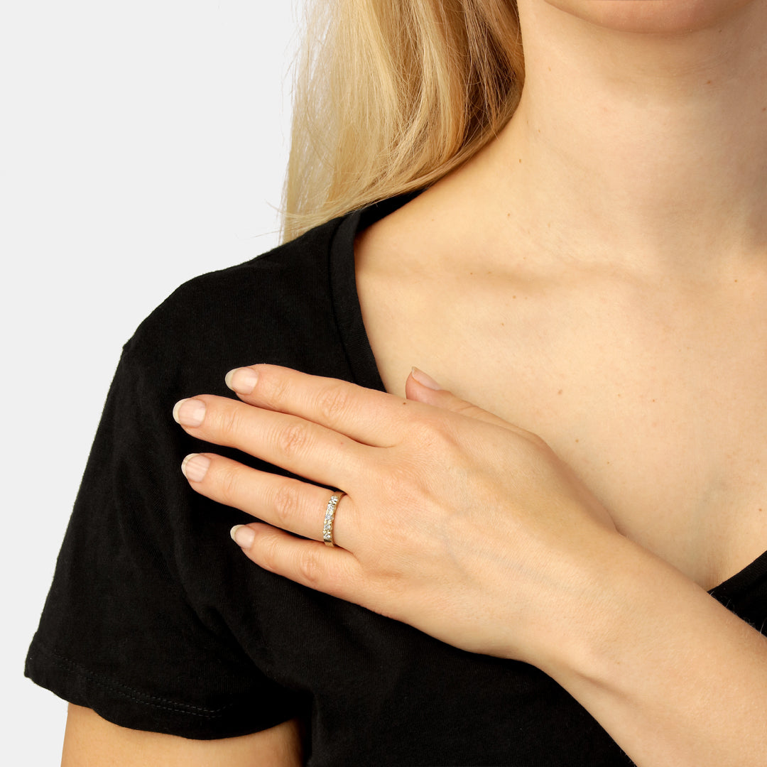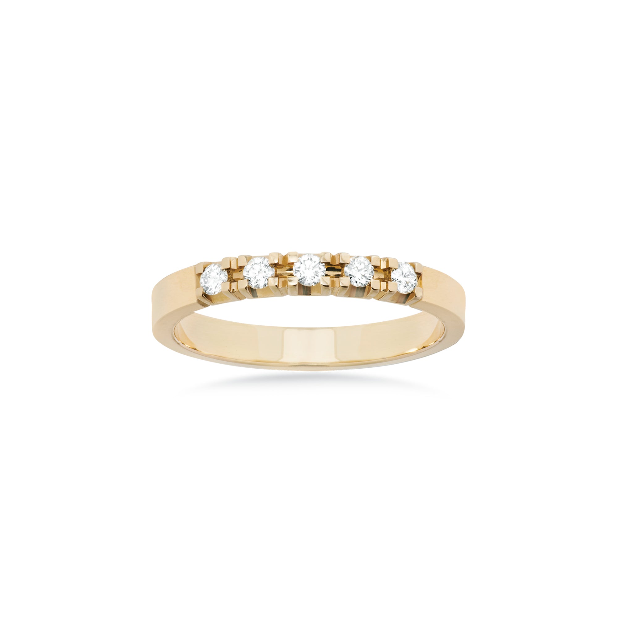 Ringen har en glat og poleret overflade, der føles behagelig mod huden. De fem diamanter er omhyggeligt indfattet, hvilket fremhæver deres naturlige skønhed og skaber en harmonisk balance mellem guldets varme tone og diamantens klare glans. Den slanke profil gør ringen let at bære alene eller sammen med andre smykker, hvilket giver dig mulighed for at skabe dit eget unikke udtryk.