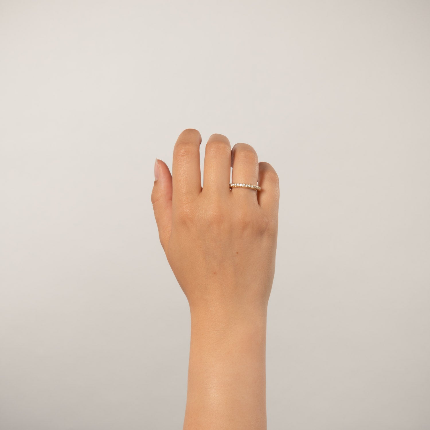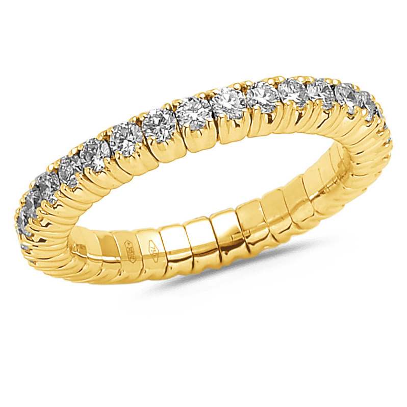 Ringen er udført i en smuk guldfarve, der komplementerer de funklende diamanter perfekt. Den fleksible struktur gør, at ringen tilpasser sig din finger, hvilket giver en behagelig og sikker pasform. De indfattede diamanter er omhyggeligt udvalgt for deres klarhed og glans, hvilket sikrer, at ringen fanger lyset fra alle vinkler.