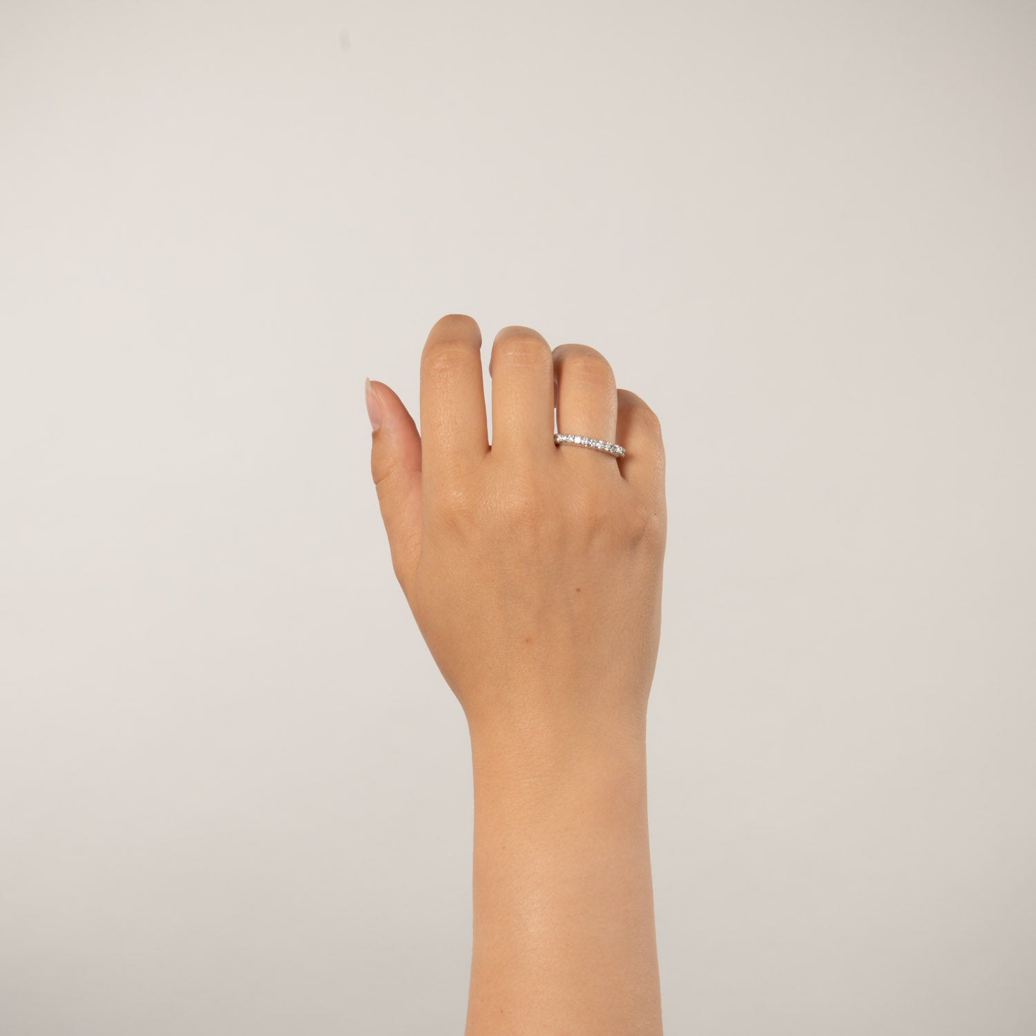 Ringen er udsmykket med funklende diamanter, der er omhyggeligt sat i en fleksibel indfatning. Dette giver ikke kun en smuk visuel effekt, men også en unik følelse af lethed og bevægelse. Den skinnende overflade af hvidguld fremhæver diamantens klare skønhed og tilføjer et strejf af luksus til enhver lejlighed.