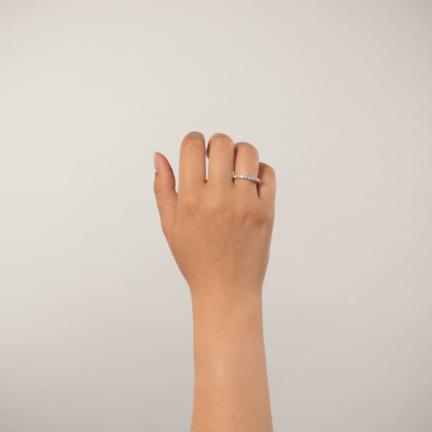 Ringen er udført med en række glitrende diamanter, der er omhyggeligt indfattet for at maksimere deres lysreflektion. Hvidguldet skaber en smuk kontrast til de klare diamanter, hvilket fremhæver ringens luksuriøse udtryk. Den fleksible konstruktion gør, at ringen tilpasser sig din finger, hvilket sikrer både komfort og stil.