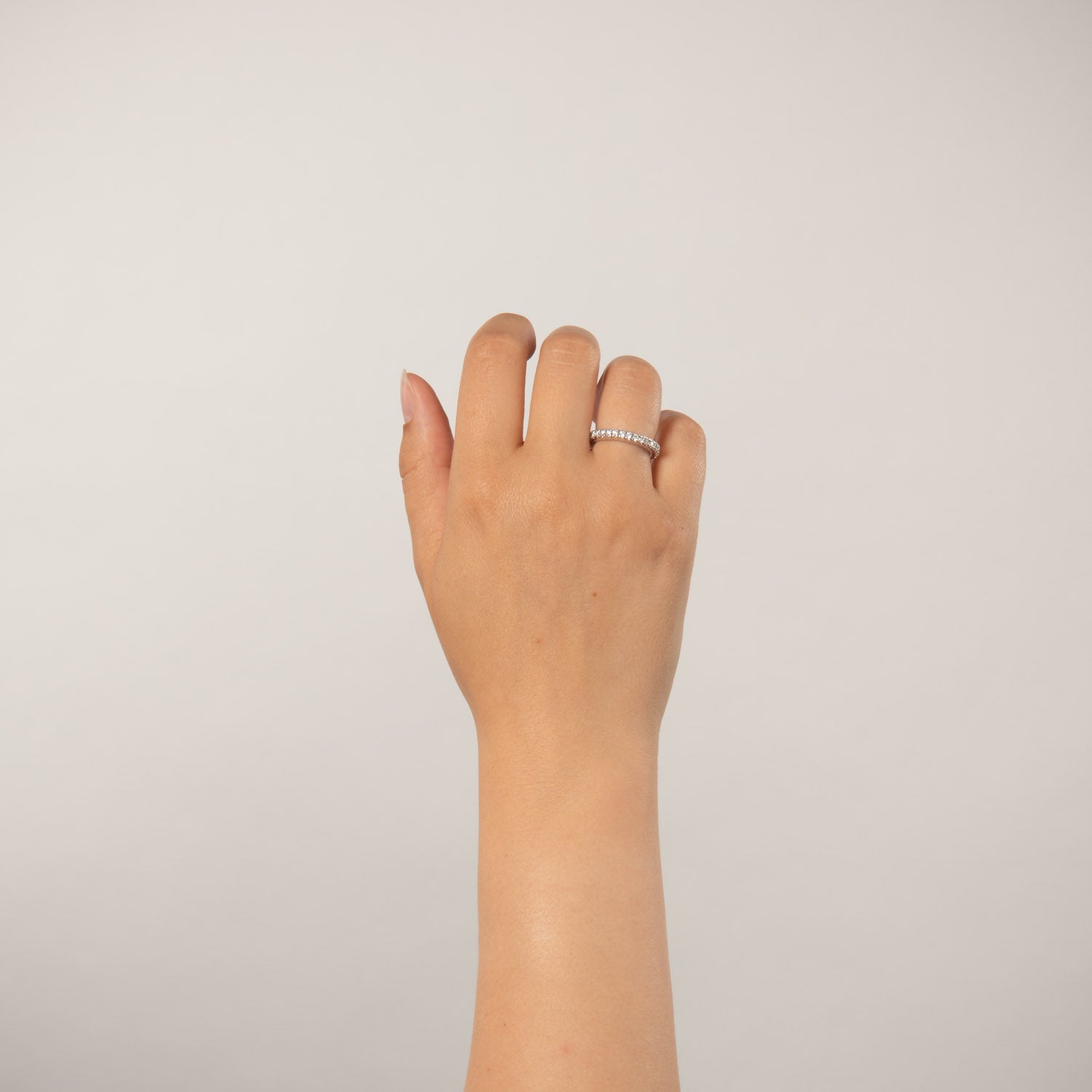 Billedet viser ringens udsøgte håndværk med diamanter, der er sat tæt sammen for at skabe en kontinuerlig glans. Hvidguldet giver en kølig, sofistikeret baggrund, der fremhæver stenens skønhed. Den glatte overflade og den præcise indfatning sikrer, at ringen føles lige så godt, som den ser ud.