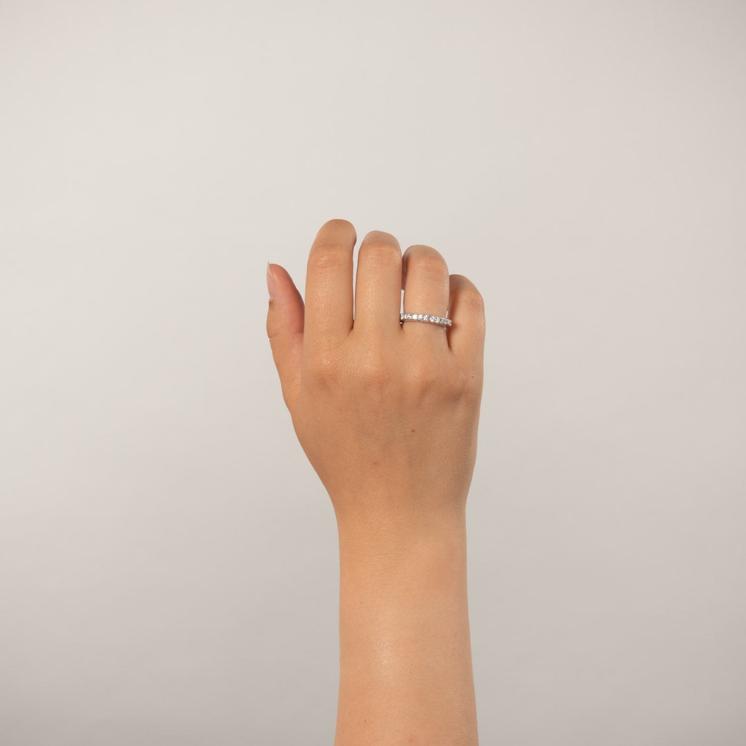Ringen er udsmykket med en række funklende diamanter, der fanger lyset fra alle vinkler. Den glatte overflade af hvidguld skaber en elegant kontrast til de klare sten, hvilket gør ringen til et blikfang. Den fleksible konstruktion sikrer, at ringen sidder perfekt på fingeren uden at klemme.