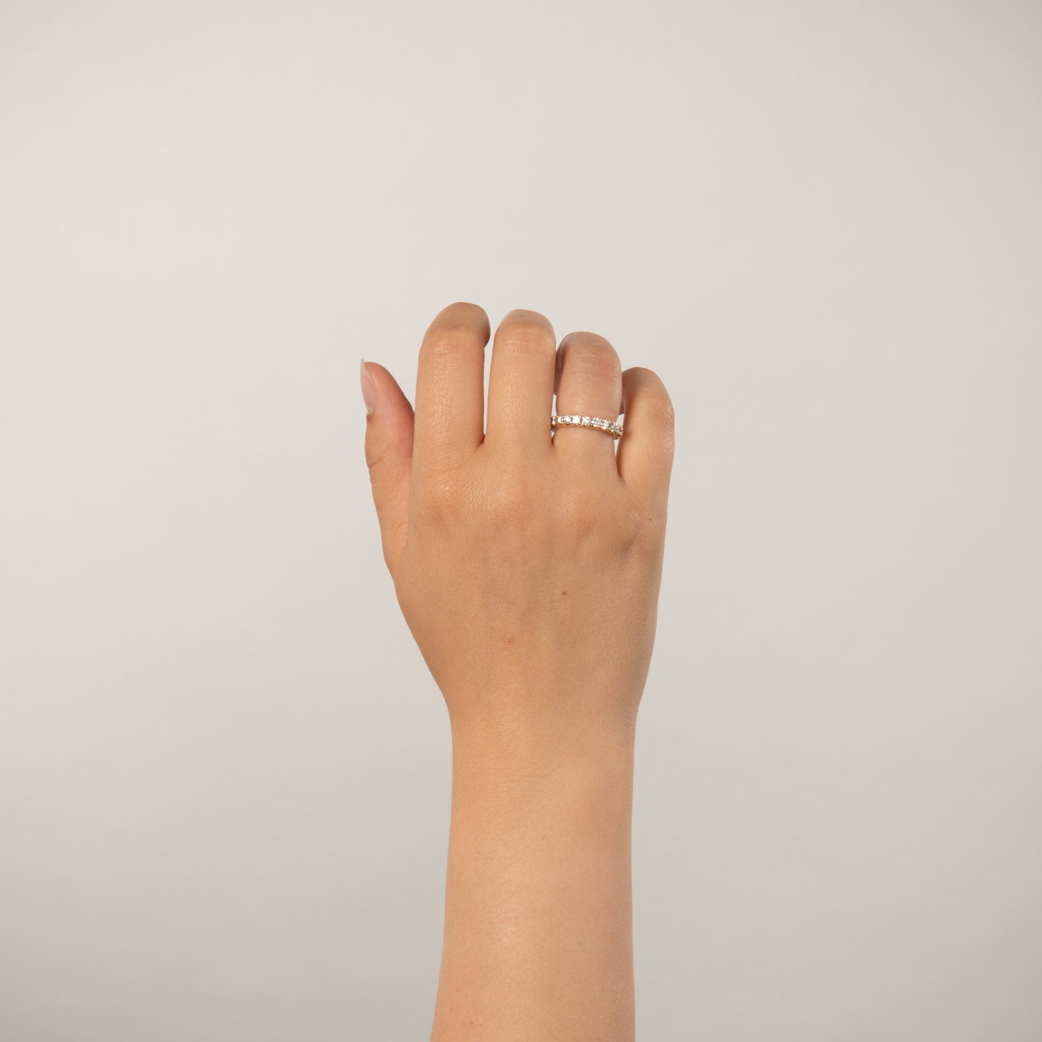 Ringen er en sand fryd for øjet med sine strålende diamanter, der er omhyggeligt indfattet i det glødende guld. Den fleksible struktur gør, at ringen tilpasser sig din finger, hvilket sikrer både komfort og stil. Den gyldne nuance af 18 karat guld fremhæver diamantens klare skønhed og skaber en harmonisk balance mellem luksus og funktionalitet.