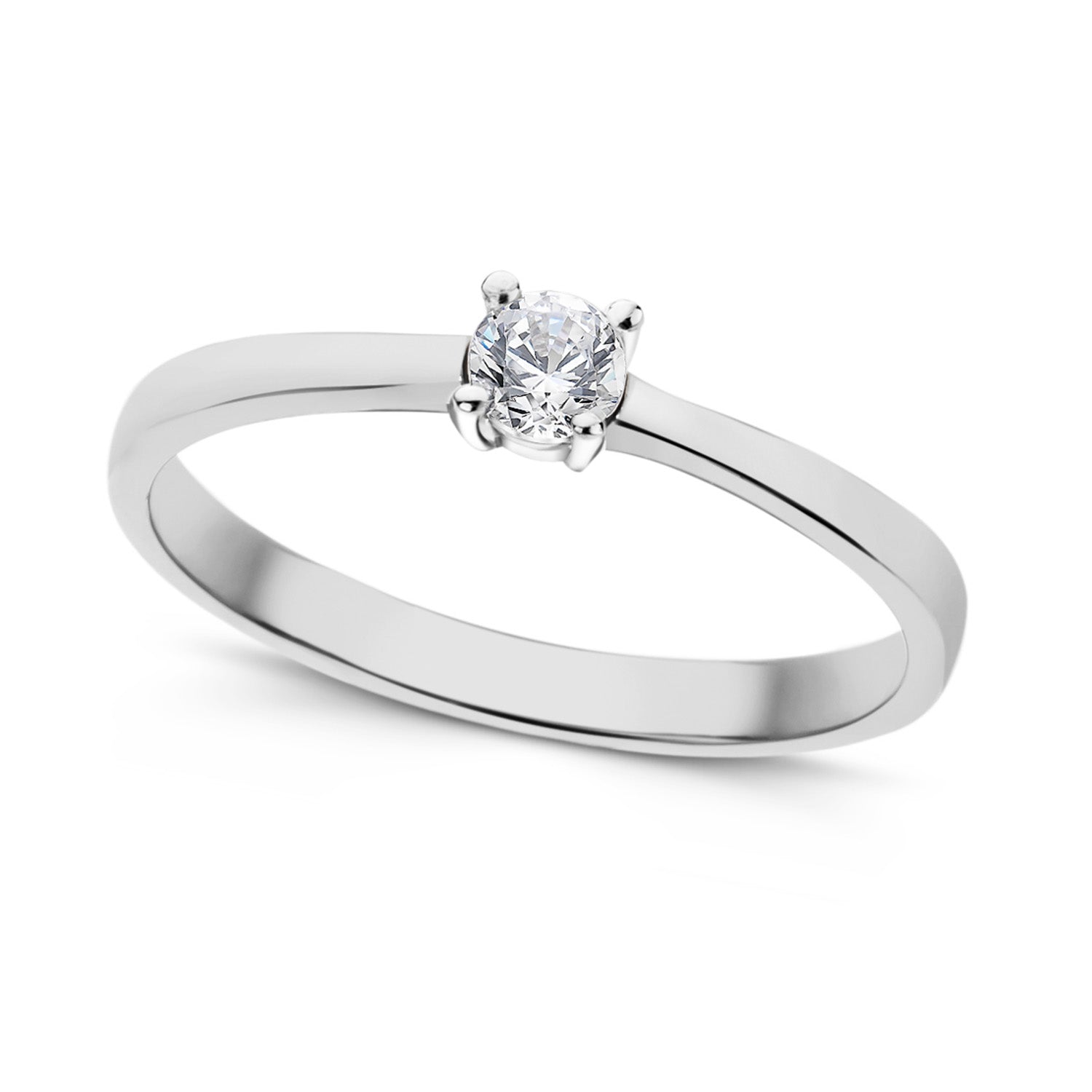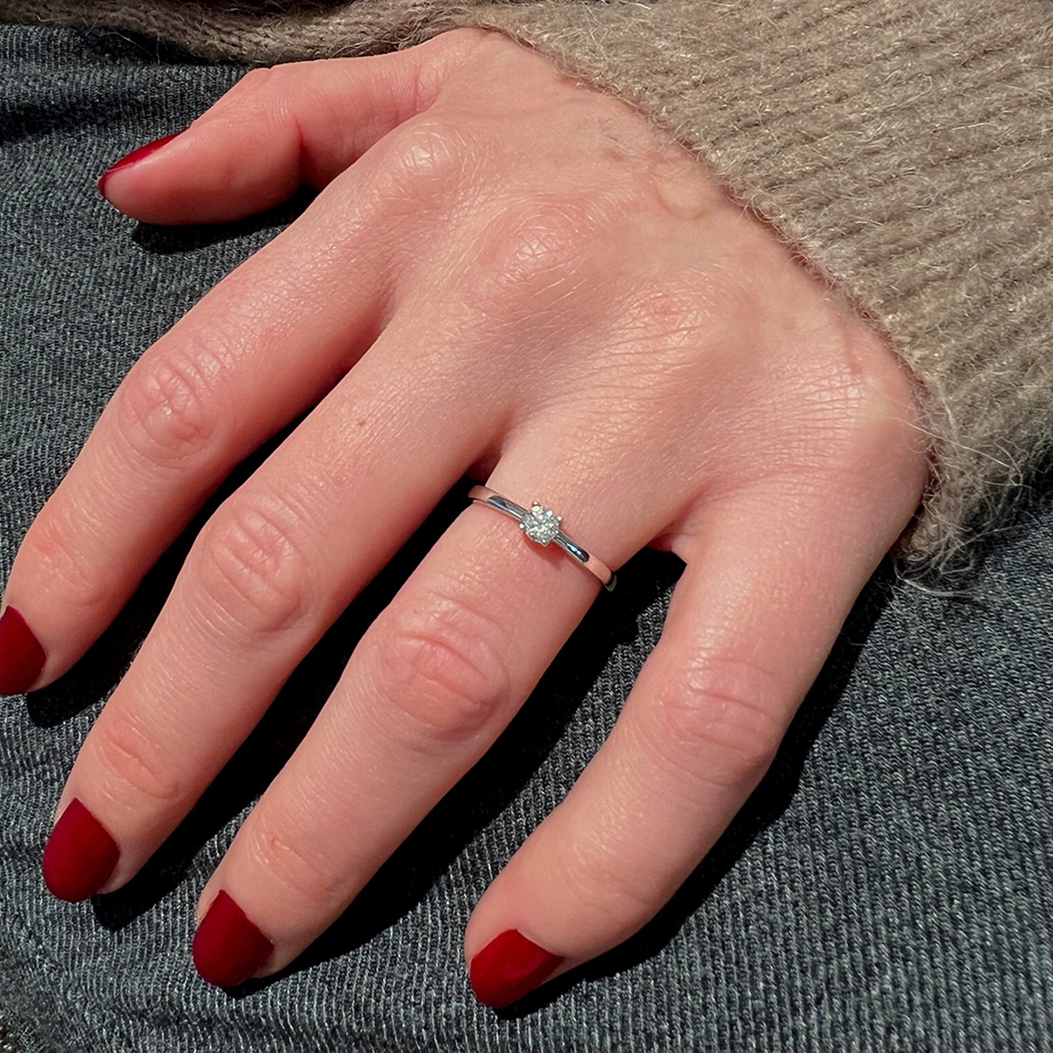Den glatte overflade af hvidguld reflekterer lyset smukt og fremhæver ringens enkle elegance. Solitaireringen er designet til at være både stilfuld og komfortabel, hvilket gør den ideel til daglig brug. Med denne ring kan du udtrykke din personlige stil og samtidig bære et smykke, der fortæller en historie om kærlighed og engagement.