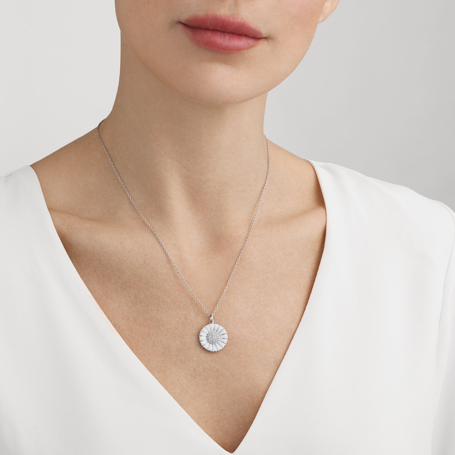 Vedhænget er inspireret af den klassiske margueritblomst, hvilket giver det et naturligt og feminint udtryk. Den detaljerede udformning af kronbladene skaber en smuk tekstur, der fanger lyset på en subtil måde. Den sølvfarvede finish tilføjer en moderne kant, mens den delikate kæde sikrer en behagelig pasform.