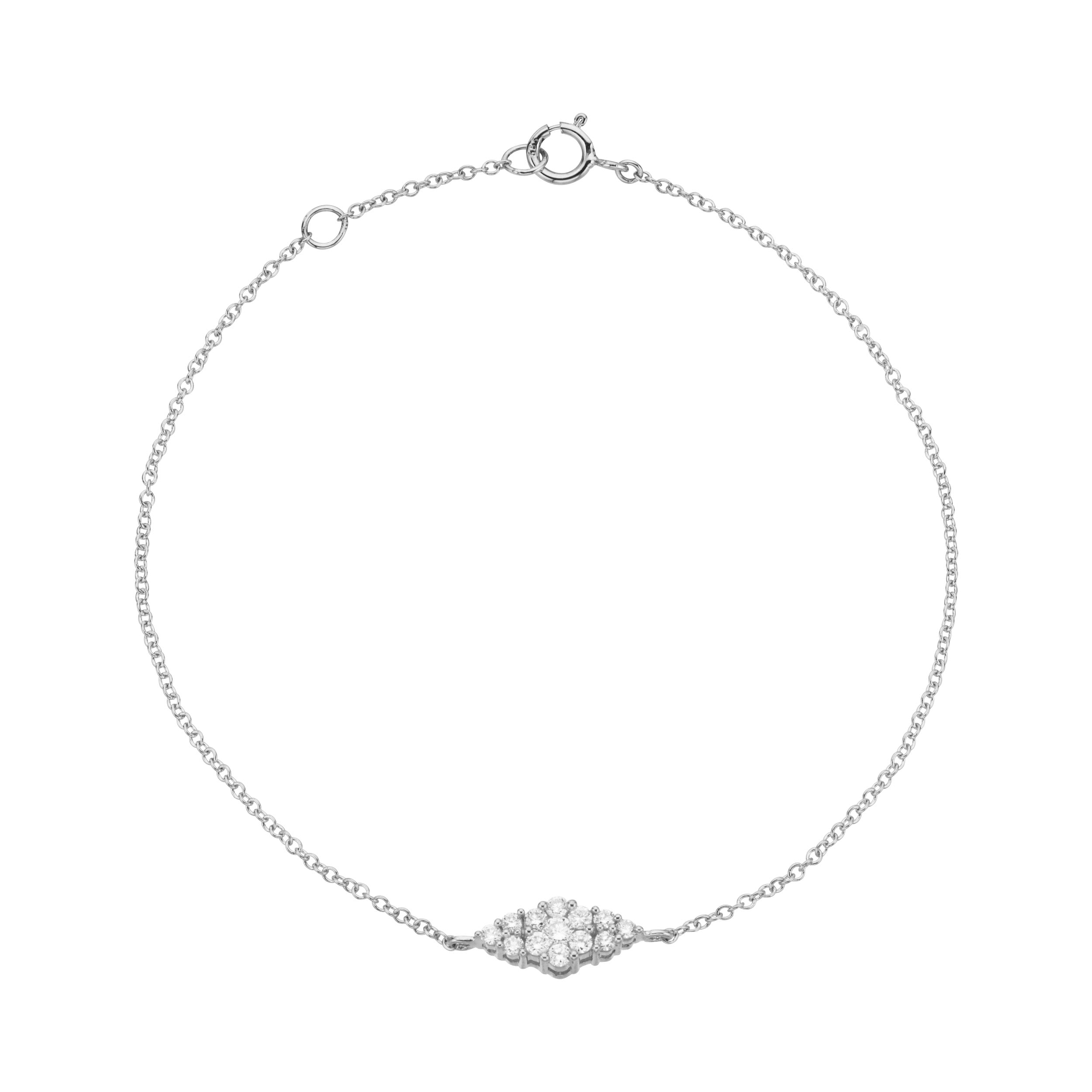 Armbåndets delikate kæde og diamantbesatte midterstykke skaber en harmonisk balance mellem enkelhed og luksus. Den kølige tone af hvidguld fremhæver de klare diamanters skønhed, hvilket gør det til et ideelt valg for dem, der ønsker et diskret, men iøjnefaldende smykke.