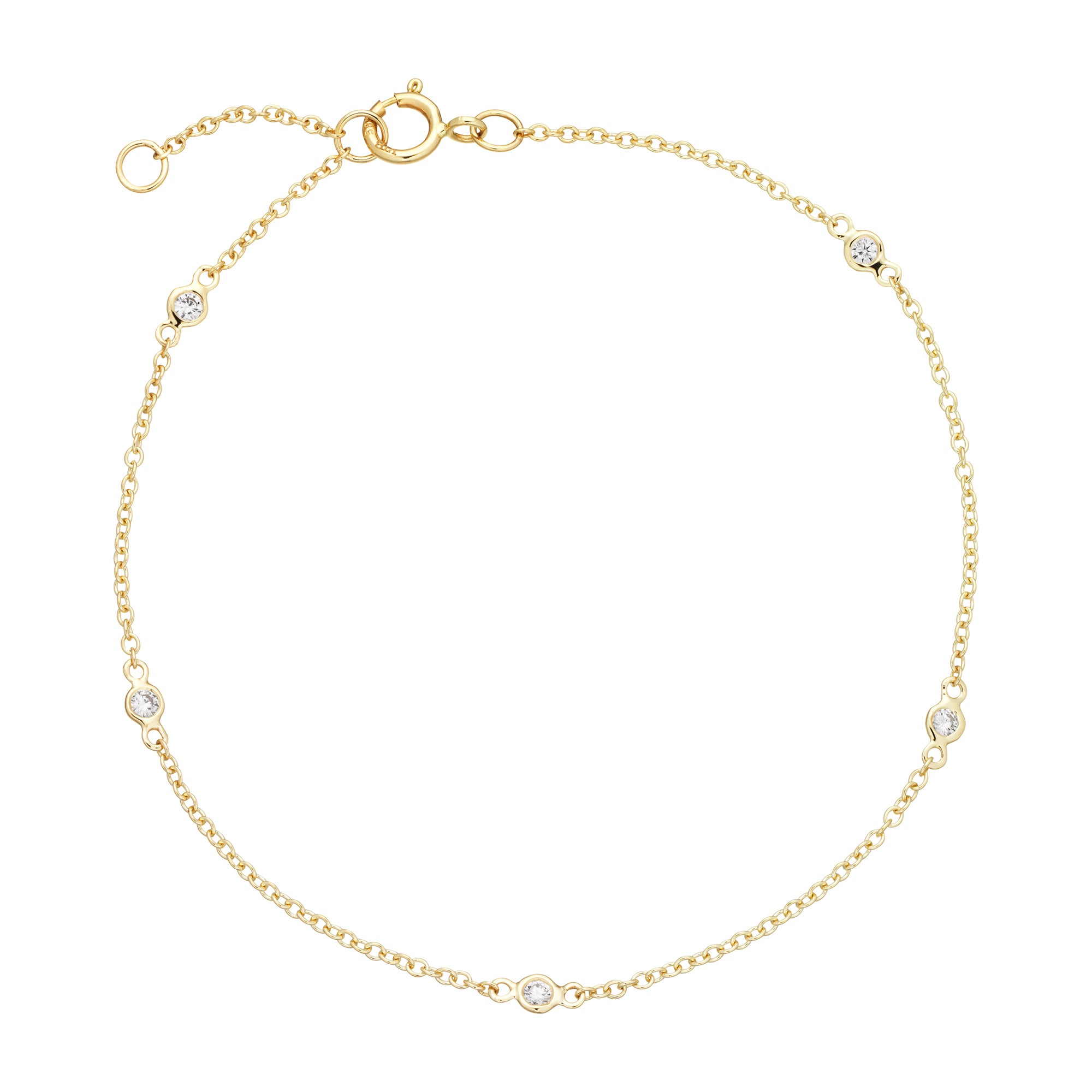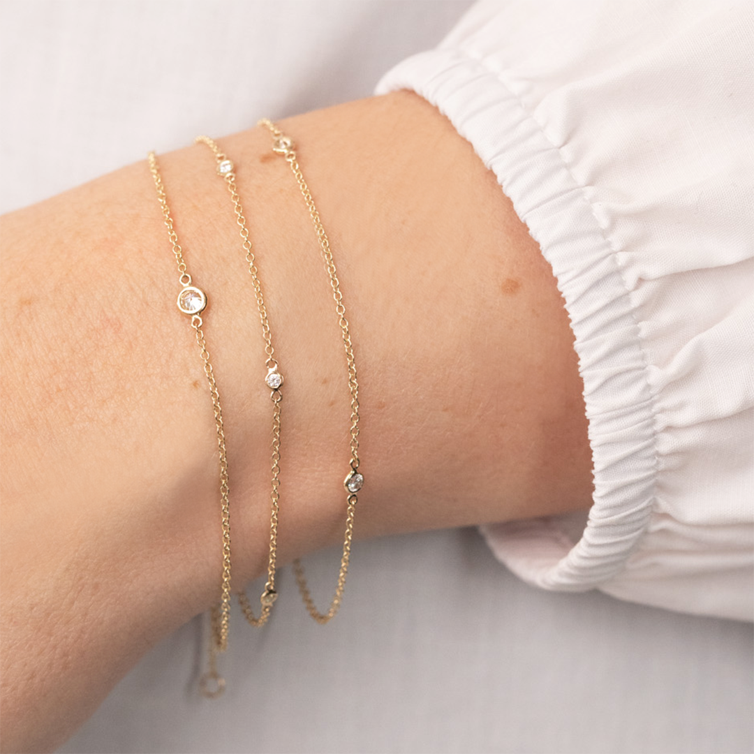 Armbåndet har en fin kæde, der smyger sig elegant om håndleddet. De indfældede diamanter er jævnt fordelt, hvilket skaber en harmonisk balance mellem guldets varme tone og stenens klare glans. Den delikate kæde og de små, men strålende diamanter gør armbåndet til et alsidigt smykke, der kan bæres alene eller sammen med andre favoritter.