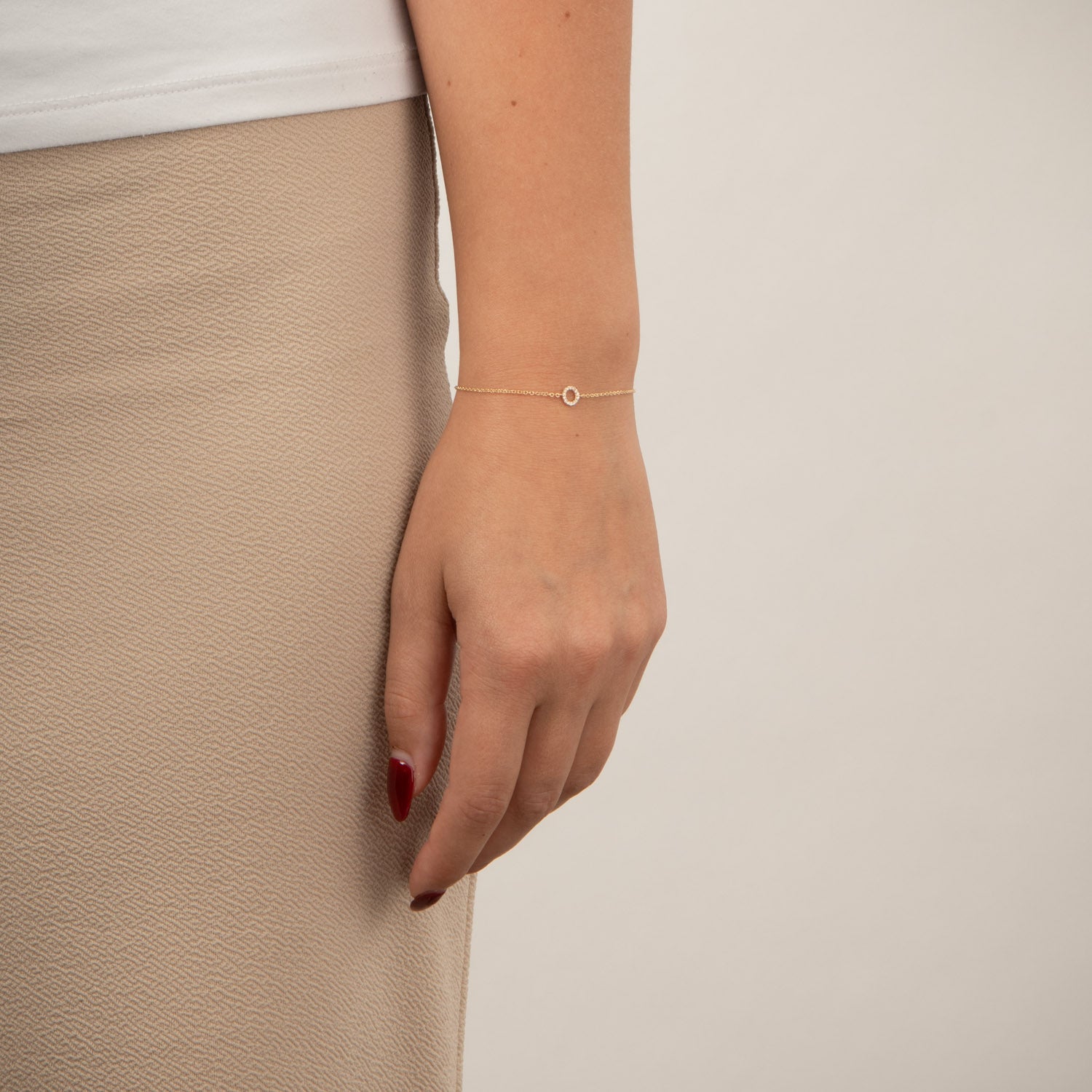 Armbåndet har en fin kæde, der smyger sig elegant om håndleddet. Det cirkulære vedhæng er besat med små diamanter, der skaber en strålende effekt. Den varme gyldne farve af 14 karat guld fremhæver armbåndets luksuriøse karakter og passer perfekt til enhver hudtone.