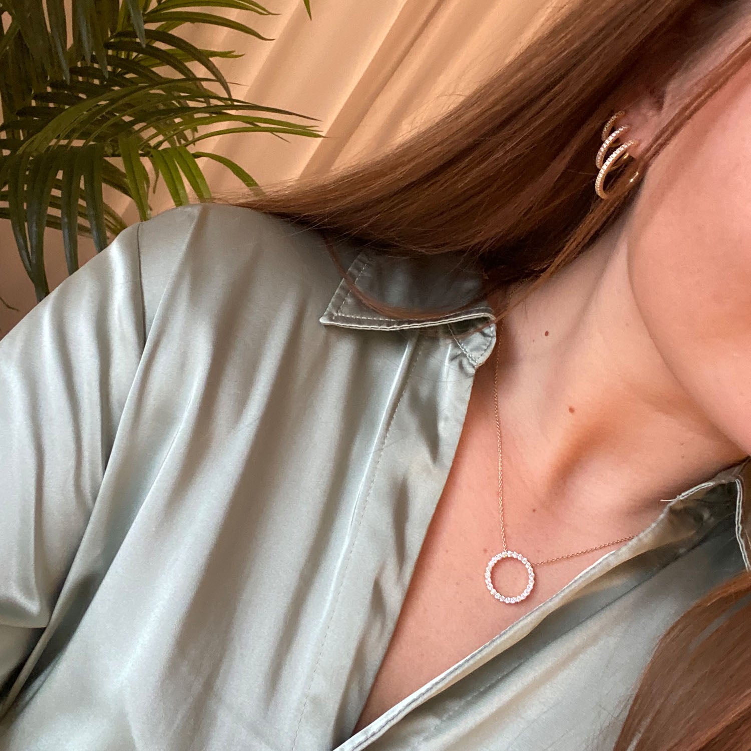 Den fine kæde i 14 karat guld er både stærk og delikat, hvilket sikrer komfortabel brug hele dagen. Diamanternes klare skær fanger lyset fra alle vinkler, hvilket skaber en betagende visuel effekt. Den subtile, men alligevel iøjnefaldende cirkel af diamanter tilføjer et strejf af luksus til ethvert outfit.