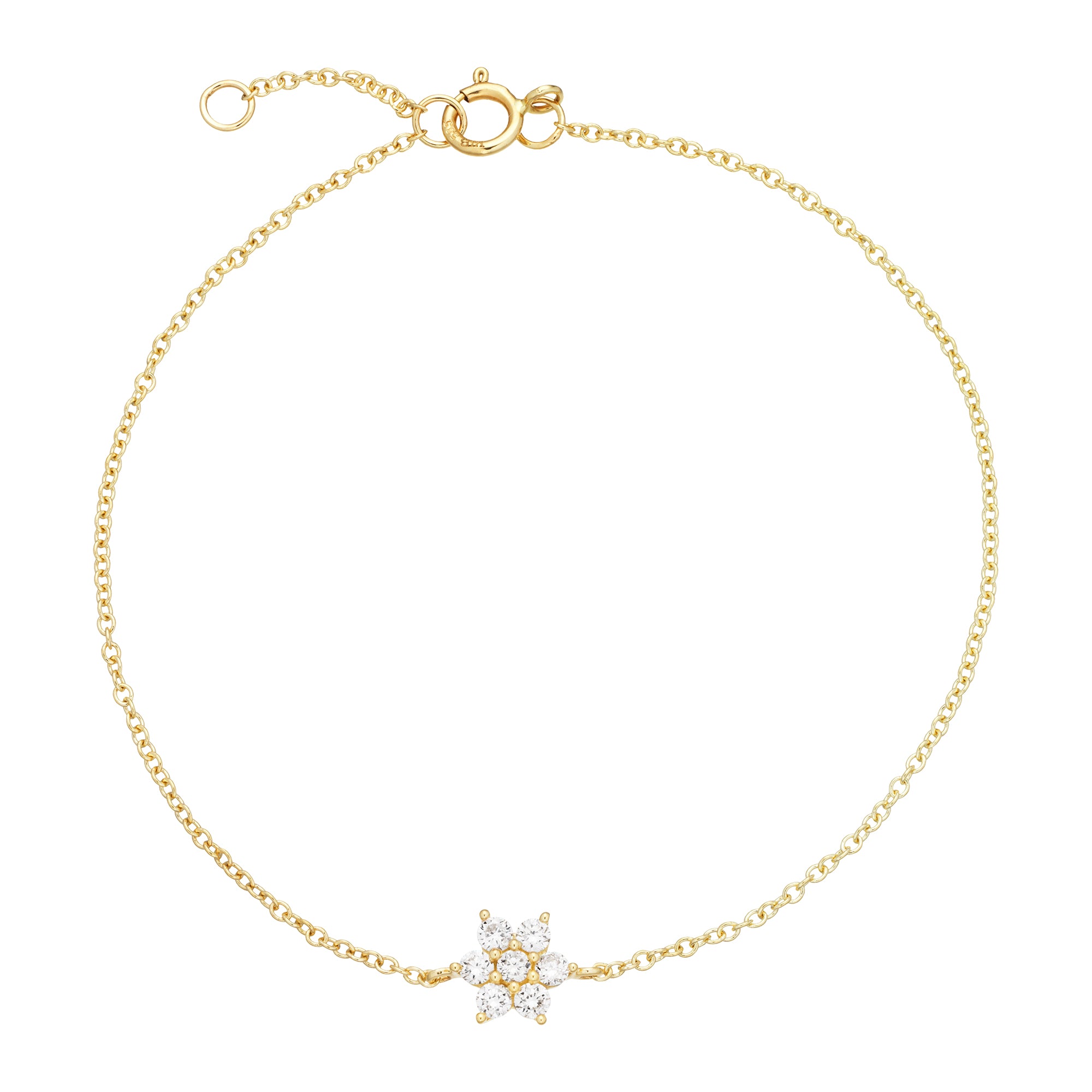 Armbåndet har en delikat kæde, der smyger sig om håndleddet med lethed. Den centrale blomstermotiv, besat med funklende diamanter, tilføjer en unik detalje, der fanger lyset fra alle vinkler. Den fine kæde og det elegante design gør det nemt at kombinere med andre smykker, eller bære alene for et minimalistisk udtryk.
