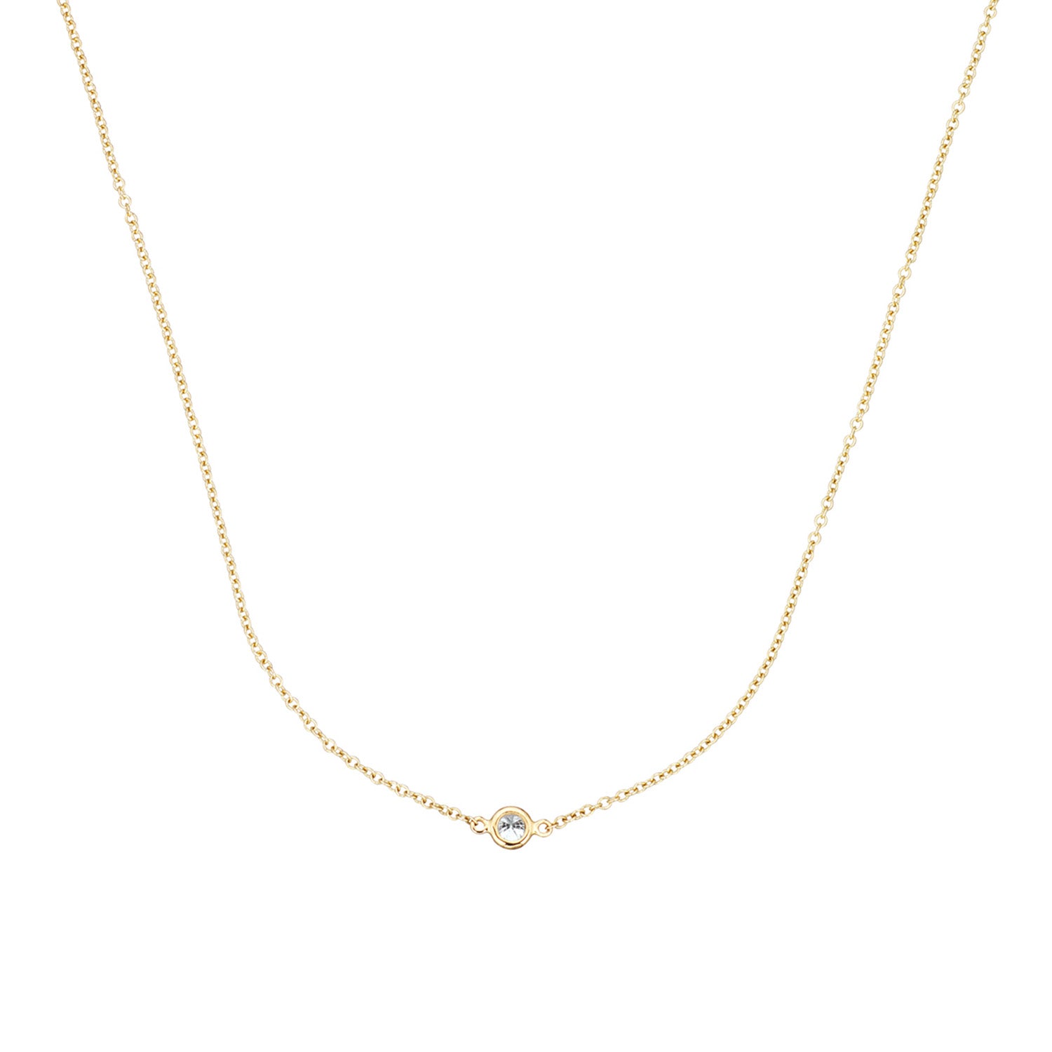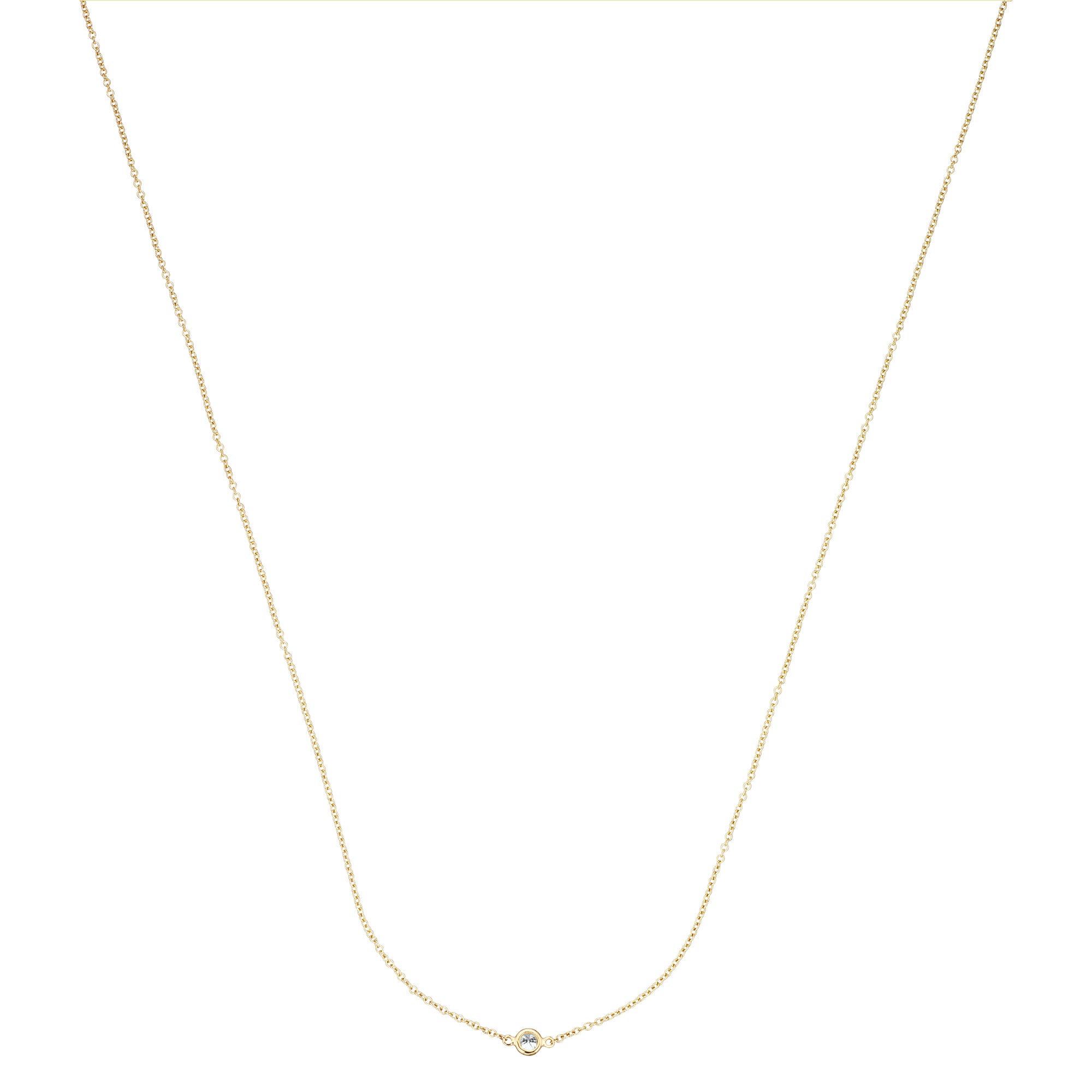 Halskæden har en fin kæde, der smyger sig elegant om halsen og fremhæver den funklende diamant i midten. Den gyldne farve skaber en varm og indbydende glød, der komplementerer enhver hudtone. Den enkle, men sofistikerede stil gør den ideel til at bære alene eller i kombination med andre smykker.