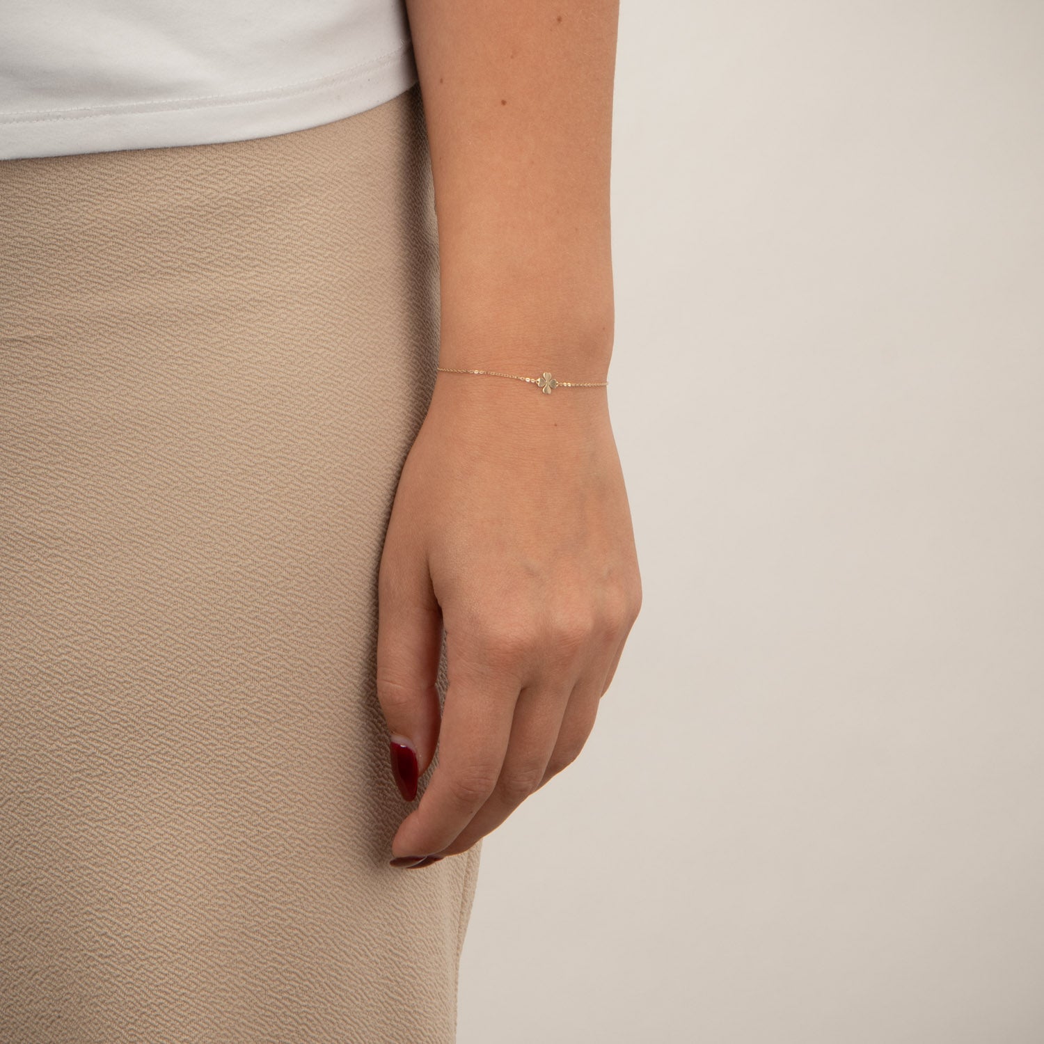 Armbåndet har en fin kæde, der føles let og behagelig mod huden. Det gyldne firkløver er centralt placeret og tilføjer en subtil glans, der fanger lyset smukt. Den varme guldtonen fremhæver hudens naturlige skønhed og giver et sofistikeret touch til ethvert outfit.