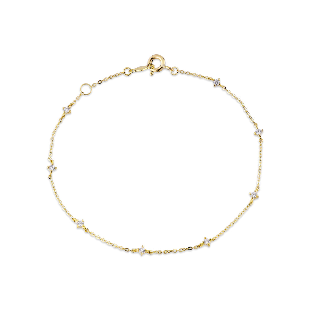 Armbåndet har en fin kæde, der føles let og behagelig mod huden. De små zirkonia er jævnt fordelt langs kæden og fanger lyset på en måde, der skaber en subtil, men iøjnefaldende glans. Den varme gyldne farve af guldet komplementerer zirkoniaens klare skær, hvilket gør armbåndet til et alsidigt smykke, der kan bæres både til hverdag og fest.