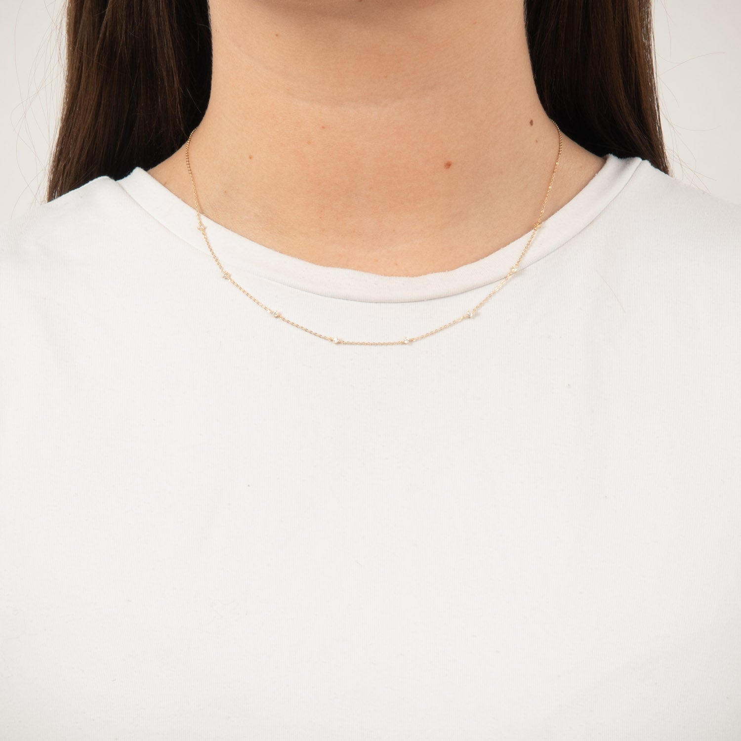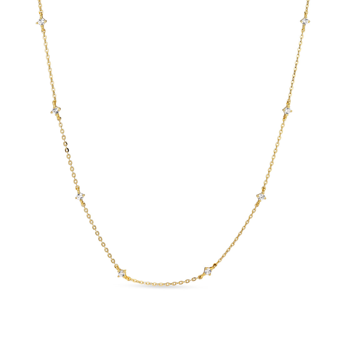 Halskæden har en fin og delikat kæde, der føles let og behagelig mod huden. De små zirkonia er jævnt fordelt langs kæden og skaber et harmonisk udtryk, der passer til både hverdag og festlige lejligheder. Den varme, gyldne farve af guldet komplementerer enhver hudtone og tilføjer et sofistikeret touch til dit look.