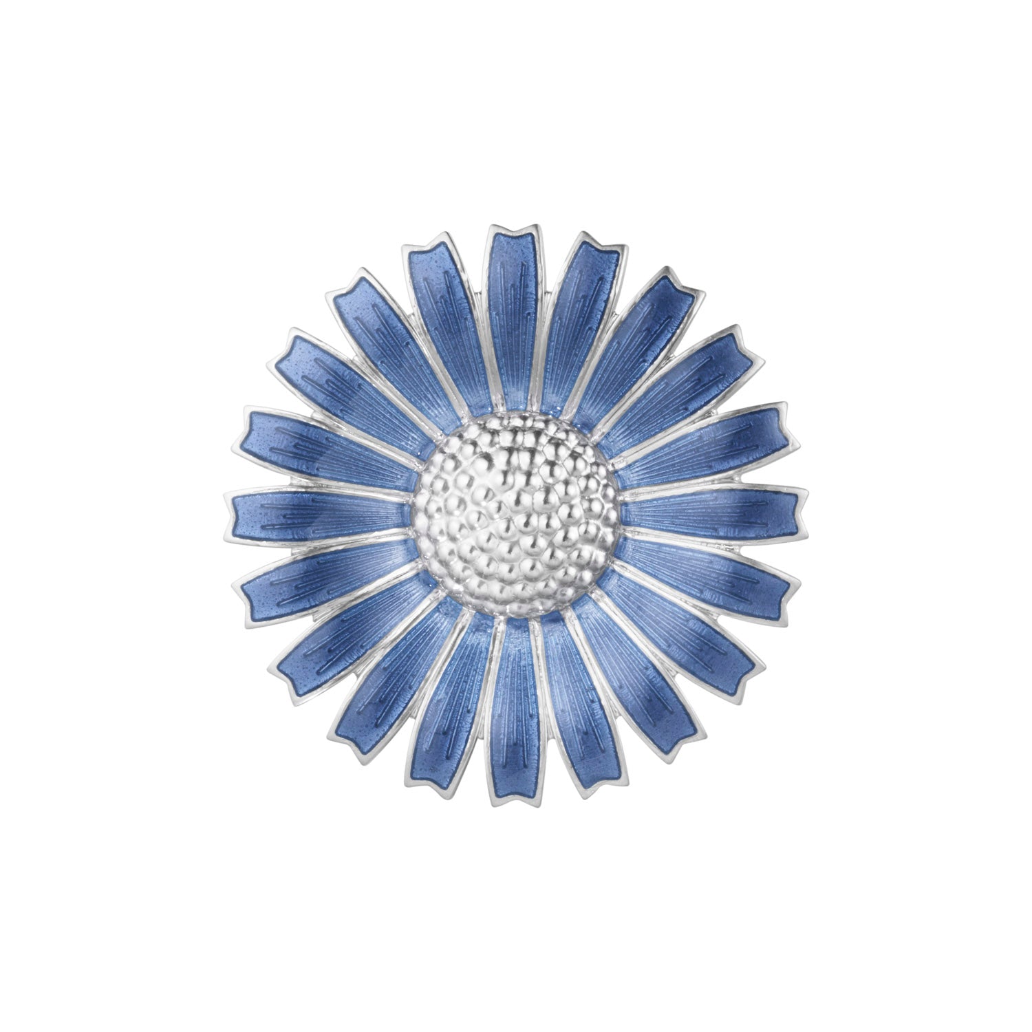 Billedet viser brochen i en smuk blå nuance, der minder om en klar sommerhimmel. De delikate kronblade er omhyggeligt udformet i sølv, hvilket giver en fin kontrast til den blå emalje. Den centrale del af blomsten har en tekstureret overflade, der tilføjer dybde og karakter til designet.