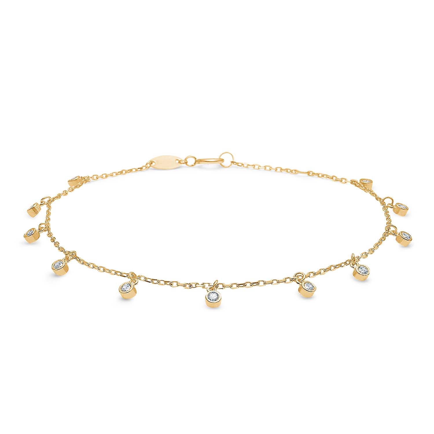 Armbåndet har en fin kæde, der smyger sig elegant om håndleddet. De små zirkonia vedhæng fanger lyset smukt og tilføjer en subtil glans. Den gyldne farve giver en varm og indbydende følelse, der komplementerer enhver hudtone. Dette armbånd er ikke kun et smykke, men en oplevelse af luksus og stil.