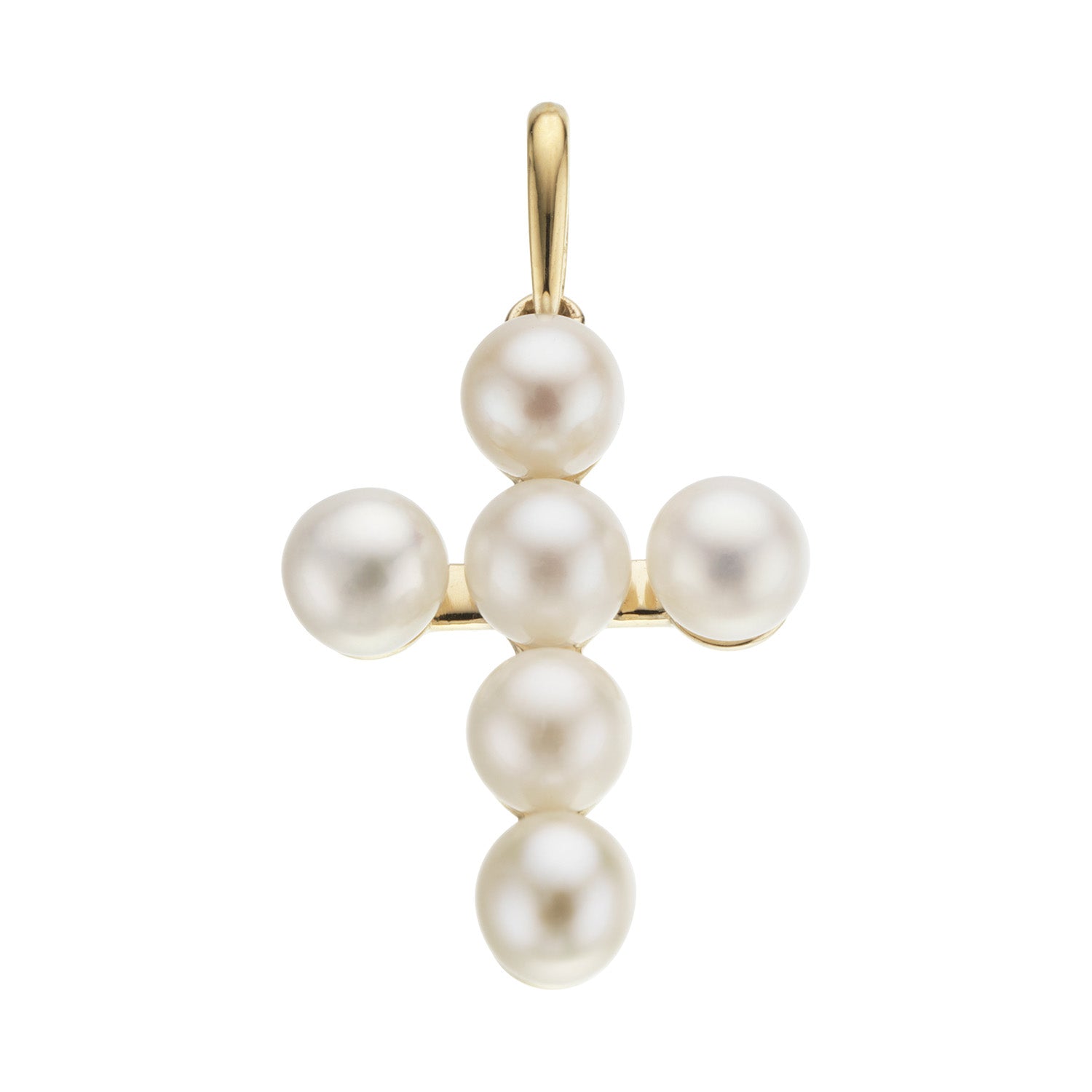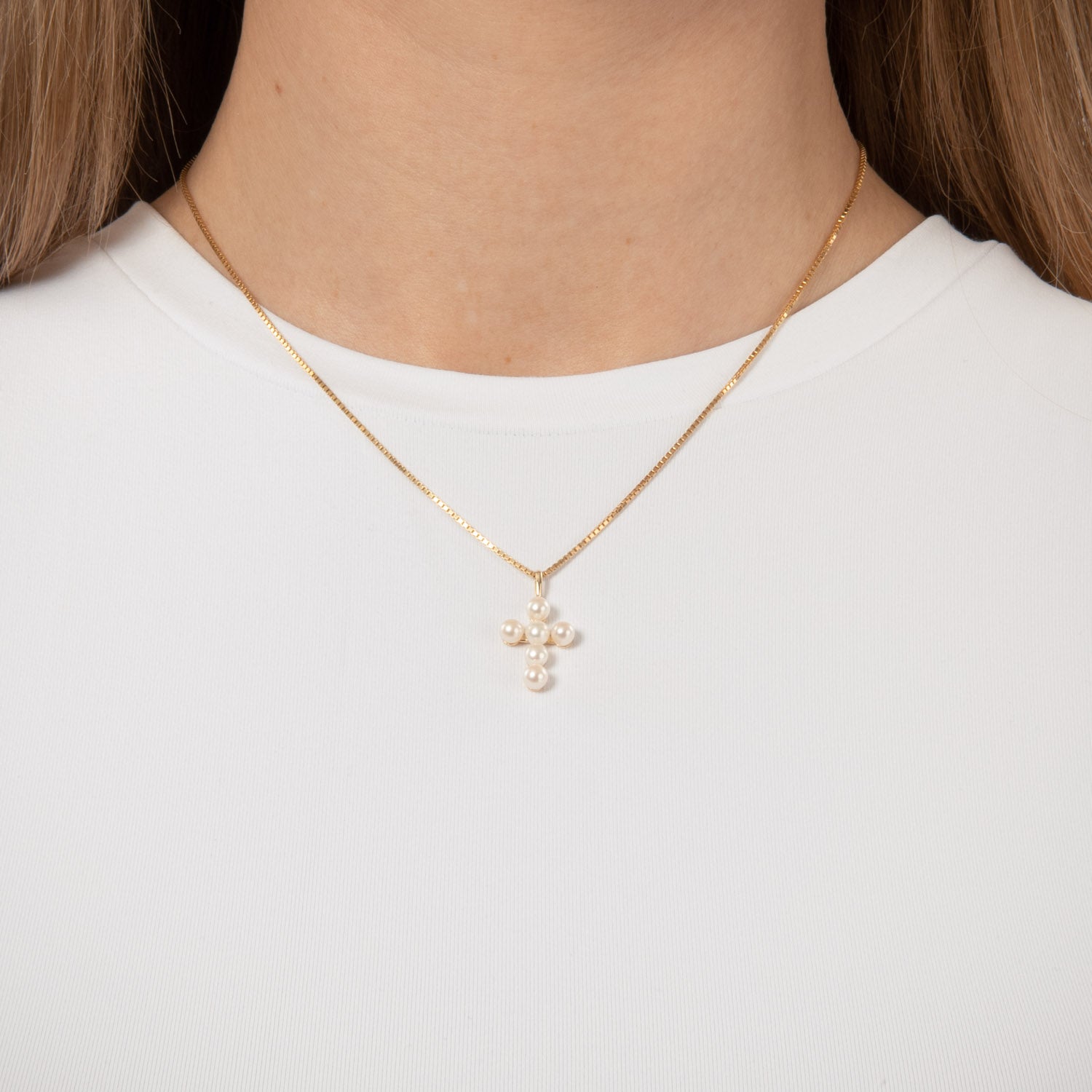 Vedhænget er formet som et kors, hvilket giver det en symbolsk betydning og en tidløs appel. De glatte, gyldne overflader reflekterer lyset smukt, hvilket skaber en subtil glans, der fanger øjet. Den varme gyldne farve tilføjer en luksuriøs følelse, mens de perfekt afrundede perler giver en blød og elegant tekstur.