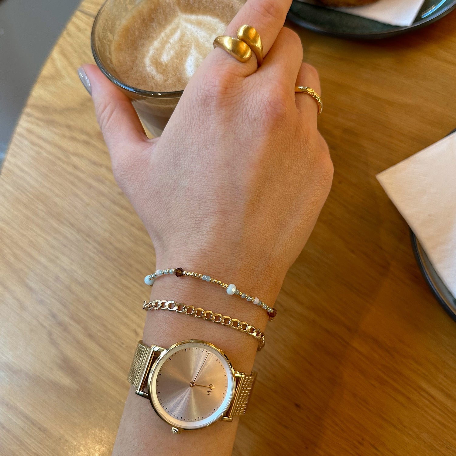 Dette armbånd udstråler en varm, gylden glød, der fanger lyset smukt. De tætsiddende led i panserdesignet giver en glat og behagelig tekstur, der føles luksuriøs mod huden. Den forgyldte overflade fremhæver armbåndets raffinerede udtryk, hvilket gør det til et alsidigt smykke, der kan bæres alene eller sammen med andre favoritter.
