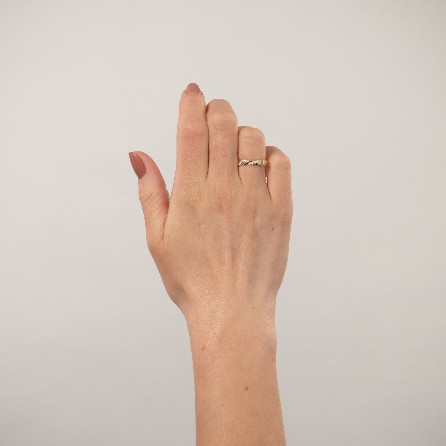 Den snoede struktur giver ringen en unik tekstur, der fanger lyset smukt og tilføjer et strejf af luksus til dit look. Uanset om du bærer den alene eller i kombination med andre smykker, vil denne ring altid tiltrække opmærksomhed.